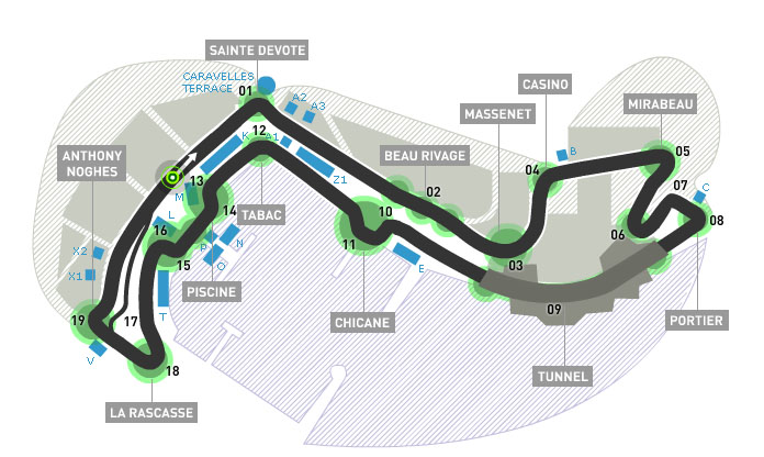 Монако Монте Карло - Карта трассы (Monaco Monte Carlo circuit diagram)Конфигурация трассы Монако - круг в Монте-Карло(Конфигурация с 2015-2018 годов) ![]() Конфигурация 2008-2013 годы: Страна: Монако Название трассы: круг в Монте-Карло Monaco, Monte Carlo - Circuit de Monaco Количество кругов: 78 Длина круга: 3.337 км (уменьшилась на 3 метра) Длина гонки: 260.286 км Даты гонок: 25,05,2008, 24,05,2009, 16,05,2010, 29,05,2011, 27-05-2012, 26,05,2013, 24.05.2015, 29 мая 2016 (дождевая гонка), 28 мая 2017, 27 мая 2018 коротко о трассе: Единственная трасса в календаре протяженностью круга менее 4 км 3337, а также единственная трасса на которой гонщики не достигают скорости в 300 км/ч. Перепад высот на трассе 41.8 метров (от самой нижней точки в порту до самой верхней в районе Казино) Параметры трассы c 2008 по 2014 г: Количество кругов: 78 Длина круга: 3.340 км Длина гонки: 260.520 км Рекорд круга: 1:14.439 (М Шумахер, 2004), 1:17.939 (Л Хэмильтон 2016), 1:14.820 (С Перез 2017) Прохождение кругов История трассы Гран-при Монако является единственной трассой в сезоне где каждый водитель мечтает победить. Как Indy 500 или Ле-Ман, он стоит особняком, почти отличие от спорта, из которого он родился. Сочетание точности вождения, технического совершенства и просто мужество требуется, чтобы выиграть в Монте-Карло. Именно здесь выявляются различия между лучшими и хорошими гонщиками в Формуле Один. Барьер Армко (Armco) не оставляет права на ошибку, требуя большей концентрации, чем любая другая трасса Формулы Один. Болиды здесь работают с максимальной прижимной силой и серьезными доработками тормозов. Обгон здесь почти невозможен, так что квалификация в Монако является наиболее важной, чем в любом другом Гран-при. Поворот Портье (Portier) является ключом к достижению хорошего времени круга Монако. Ему предшествует шпилька Loews, медленный поворот в Formula One, и далее следуют по туннелю. Некоторые великие гонщики закончили возле барьеров здесь, в первую очередь это Айртон Сенна и Михаэль Шумахер. Рекорды великих гонщиков в Монако помнит история. Грэм Хилл (Graham Hill), человека прозвали "Мистер Монако", и Шумахер выиграл пять раз, Ален Прост взял четыре победы, в то время как Стирлинг Мосс и Джеки Стюарт каждый выиграл здесь три раза. Но рекорд побед в княжестве проживает с Айртоном Сенной, который выиграл в Монте-Карло шесть раз. Гонка была регулярной в чемпионате мира с 1955 года, но за это время схема трассы изменилась на удивление мало. Незначительные изменения были сделаны в 2003 году, в частности, новый, мягкий вход в поворот Rascasse, и еще большие изменения были в 2004 году, новый пит комплекс и расширение обзора для зрителей. В 2015 году до ГП на городской трассе обновили асфальт. В 2017 году для победителей сделали новый подиум, теперь не как в прошлые годы внизу обливают шампанских всех, теперь они на подиуме наверху. Принц Монако Альберт 2 вручал главный приз Феттелю, а его жена принцесса Шарлен вручала кубок грустному Райконену. В 2018 году на части участки трассе положили новый асфальт. Победитель гонки выпил шампанского из боевого кроссовка, а также предложил выпить из бутылки принцу Альберту и его жене принцессе Шарлен. Победители Формулы-1 в гран-при Монако 2018 год: 1 место - Даниэль Риккардо на Ред Булл (первая победа в Монако) 2 место - Себастьян Феттель на Феррари 3 место - Льюис Хэмильтон на Мерсе 2017 1 - Даниель Рикардо (Ред Булл), 2 - Себастьян Феттель (Феррари), 3 - Льюис Хэмильтон (Мерседес) 2016 1 - Льюис Хэмильтон (Мерседес), 2 - Дан