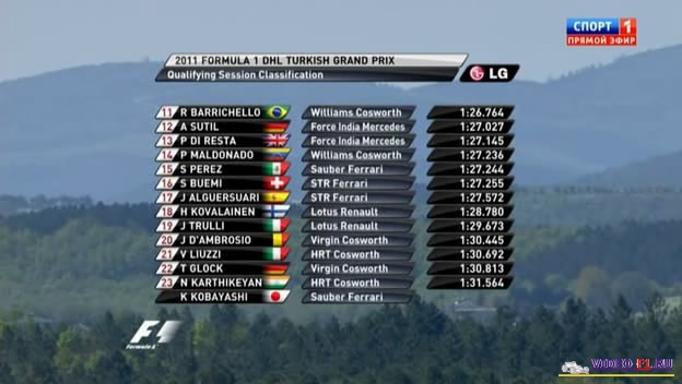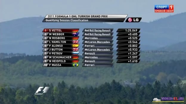 Формула 1 - 2011 - Этап 4 - гран-при Турция - КвалификацияФормула 1 - Гран-при Турция - КвалификацияСезон 2011 года - Этап 4 (Истанбул, 7 мая 2011 года) 2011 FORMULA 1 DHL TURKISH GRAND PRIX Round 4 - Istanbul Park - Qualifying Гран-при Турция - Квалификация - скачать видео Квал гран-при Турции на трассе Истанбул Парк добавлен для скачивания Температура воздуха - 18 C Температура трассы - 37 C Влажность - 27% Скорость ветра - 1.7 m/c Канал: Спорт 1 Продолжительность: 1 час 8 мин Комментарий: Русский (А. Попов) Размер файла: 700 Mb Формат: AVI Видео: 624×352 (1.77:1), 25 fps, DivX Codec 6.8.3 ~1307 kbps Аудио: 48 kHz, MP3, 2 ch, ~128.00 kbps ______ ___ __ _ _ Скачать видео гонки Формулы-1 - квалификацию гран-при Турция (Истанбул) 2011 года (Download qual) [sms_1] Ссылка на видео -> [rapidshare]https://rapidshare.com/files/461237729/201104_tur_Q.avi/4750309424550793420/483484[/rapidshare] [/sms_1] Вы смотрите Формула 1 - 2011 - Этап 4 - гран-при Турция - Квалификация
