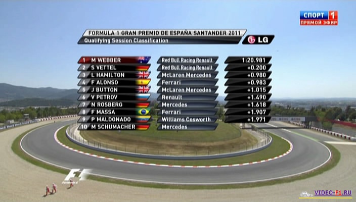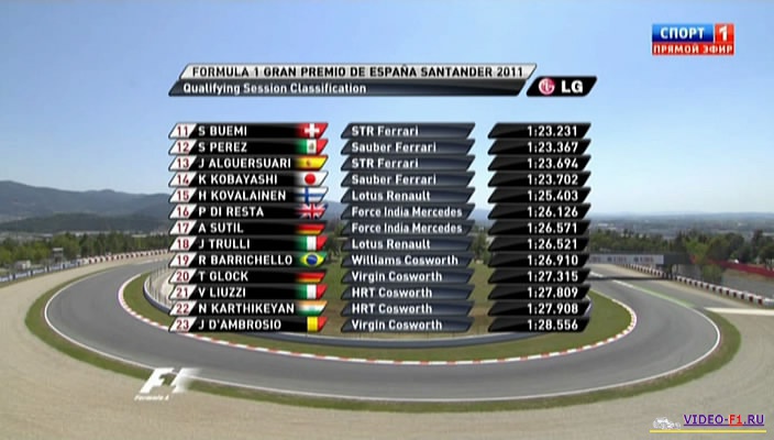 Формула 1 - 2011 - Этап 5 - гран-при Испания - КвалификацяФормула 1 - Гран-при Испания - КвалификацияСезон 2011 года - Этап 5 (Барселона - Каталунья, 21 мая 2011 года) 2011 FORMULA 1 DHL TURKISH GRAND PRIX Round 5 - Circuit de Catalunya - Qualifying Гран-при Испания - КВАЛИФИКАЦИЯ - скачать видео Квал гран-при Испании на трассе Каталунья добавлен для скачивания Шумахер (в кои то веки) и Петров в первом сегмента показали удивительные результаты. Кстати именно здесь Шумахер впервые выиграл за Скудерию Феррари, 7 раз завоевывал поул-позишн и много раз побеждал. По статистке, 16 гонок из 20 проведенных гран-при на этой трассе показали, что чаще всего выигрывает пилот занявший пол-позишн в квалификации. Вот и посмотрим завтра, насколько это правда. Температура воздуха - 24C Температура трассы - 40C Влажность - 39% Скорость ветра - 2 m/c Канал: Россия 2 Продолжительность: 1 час 20 мин Комментарий: Русский (А. Попов) Размер файла: 1 Gb Формат: AVI Видео: XviD, 1701 Кбит/с, 704x400 Аудио: MP3, 2 ch, 128 Кбит/с ______ ___ __ _ _ Скачать видео гонки Формулы-1 - квалификацию гран-при Испания (Барселона - Каталунья) 2011 года (Download qual) [sms_1] Ссылка на видео -> [rapidshare]https://rapidshare.com/files/2927397755/201105-spain-R.avi/9420484394843930700/483484[/rapidshare] [/sms_1] Вы смотрите Формула 1 - 2011 - Этап 5 - гран-при Испания - Квалификаця