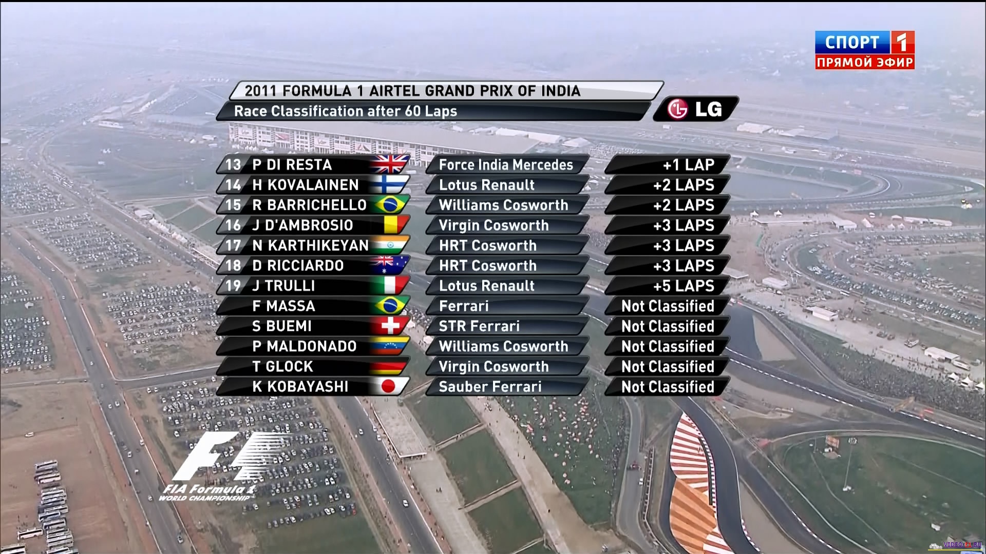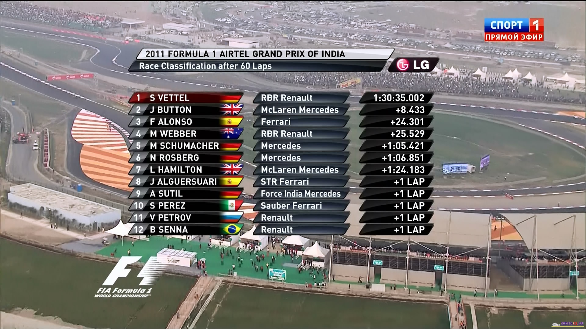 Формула 1 - 2011 - Этап 17 - гран-при Индия - ГонкаФормула 1 - Гран-при Индия - Гонка - СкачатьСезон 2011 года - Этап 17 (Нью Дели, 30 октября 2011 года) 2011 FORMULA 1 AIRTEL GRAND PRIX OF INDIA Round 17 - India - New Delhi (Buddh International Circuit) - Race Video Гран-при Индии (Ньюдели) - Гонка - скачать видео гонки Гонка гран-при Индии на трассе в городе Нью Дели добавлена для скачивания 30 октября 2011 года Первая в истории гонка гран-при Индия. Температура воздуха - 31C Температура трассы - 38C Влажность - 19% Скорость ветра - 1.9 m/s Посмотреть бесплатно 3 минутный ролик самых интересных моментах в течении первой гонки гран-при Индии 2011 годаКанал: Спорт 1 Продолжительность: 2 часа 13 мин Комментарий: Русский (Алексей Попов) Размер файла: 1.7 Gb Формат: AVI Видео: 720х400 (16:9) , 25.000 fps, 1700 kbps Аудио: MP3, 48 kHz, 2 ch, 128 kbps (гонку в высоком HD качестве (размером около 10 Gb) можно скачать - Здесь) (квалификацию можно скачать - Здесь) ______ ___ __ _ _ Скачать видео Формулы-1 - гонку гран-при Индия (Нью Дели) 2011 года в обычном SATRip качестве (Без рекламы, одним файлом)(Download gran-prix India (New Delhi) race) [sms_1] Ссылка на видео -> СКАЧАТЬ После открытия нажать DOWNLOAD и выбрать путь сохранения файла. [/sms_1] Вы смотрите Формула 1 - 2011 - Этап 17 - гран-при Индия - Гонка