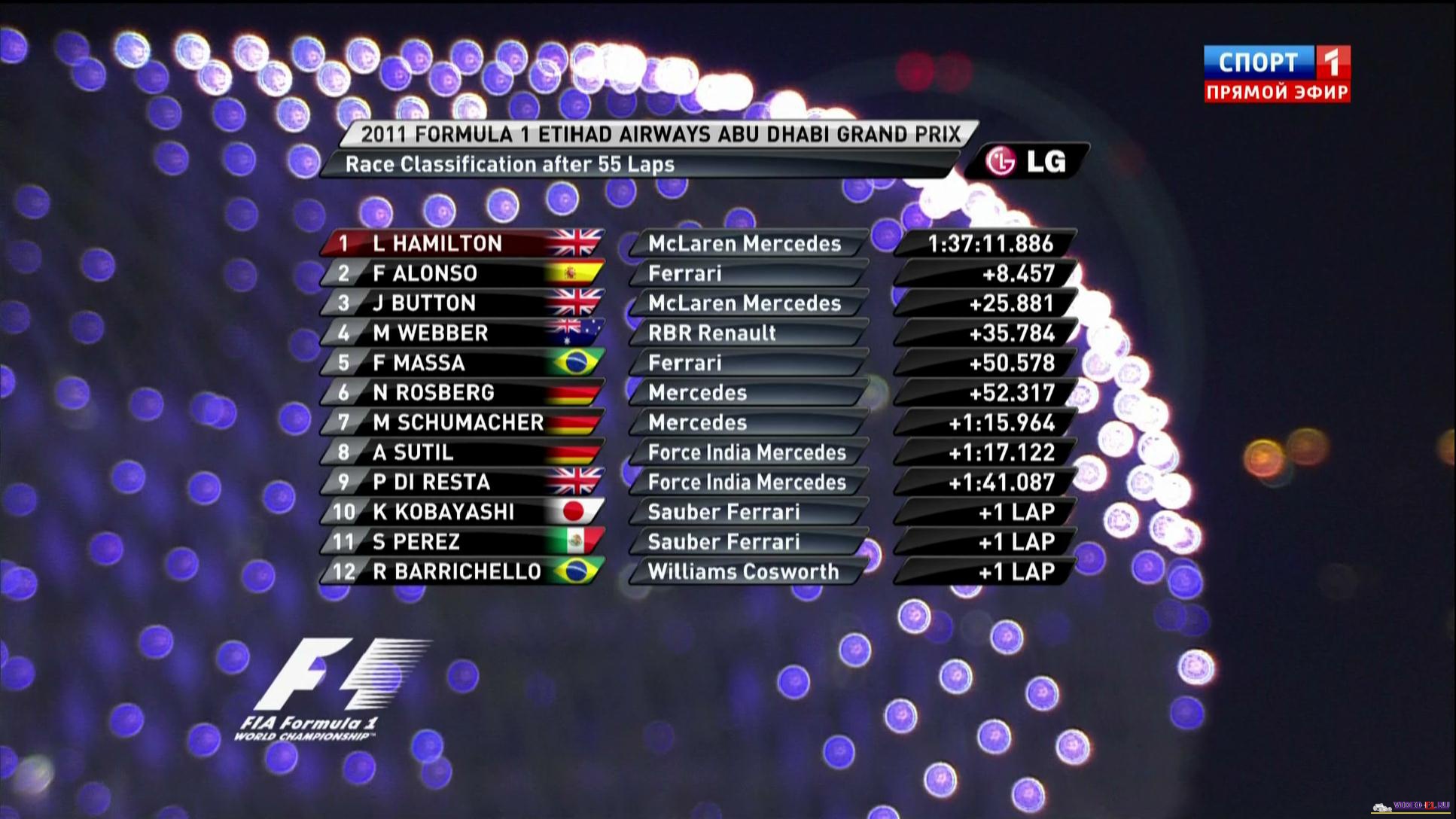 Формула 1 - 2011 - Этап 18 - гран-при Абу Даби - Гонка в HD разрешенииФормула 1 - Гран-при Абу Даби - Гонка - Скачать в HD разрешенииСезон 2011 года - Этап 18 (Яс Марино, 13 ноября 2011 года) 2011 FORMULA 1 ETIHAD AIRWAYS ABU DHABI GRAND PRIX Round 18 - Abu Dhabi - (Yas Marina) - Race HD 1080p Video Гран-при Абу Даби (Яс Марина) - Гонка - скачать видео гонки в высоком разрешении HD Гонка в высоком разрешении гран-при Абу даби на трассе на искусственном острове Яс Марина добавлена для скачивания 13 ноября 2011 года Температура воздуха - 26C Температура трассы - 31C Влажность - 57% Скорость ветра - 3.5 m/s Посмотреть бесплатно 3 минутный ролик самых интересных моментах в течении гонки гран-при Абу Даби 2011 годаКанал: Спорт 1 Продолжительность: 2 часа 16 мин Комментарий: Русский (Алексей Попов) Размер файла: 9.4 Gb Формат: ts Видео: MPEG4 Video (H264) 1920x1080i (Interlaced) (16:9) 25.00fps ~9500 Kbps Аудио: MPEG Audio 48000Hz stereo 128kbps (гонку в обычном качестве (размером около 2 Gb) можно скачать - Здесь) (квалификацию можно скачать - Здесь) ______ ___ __ _ _ Скачать видео Формулы-1 - гонку гран-при Абу Даби (Яс Марина) 2011 года в обычном SATRip качестве (Без рекламы, одним файлом)(Download gran-prix Abu Dhabi (Yas Marina) race) Вы смотрите Формула 1 - 2011 - Этап 18 - гран-при Абу Даби - Гонка в HD разрешении