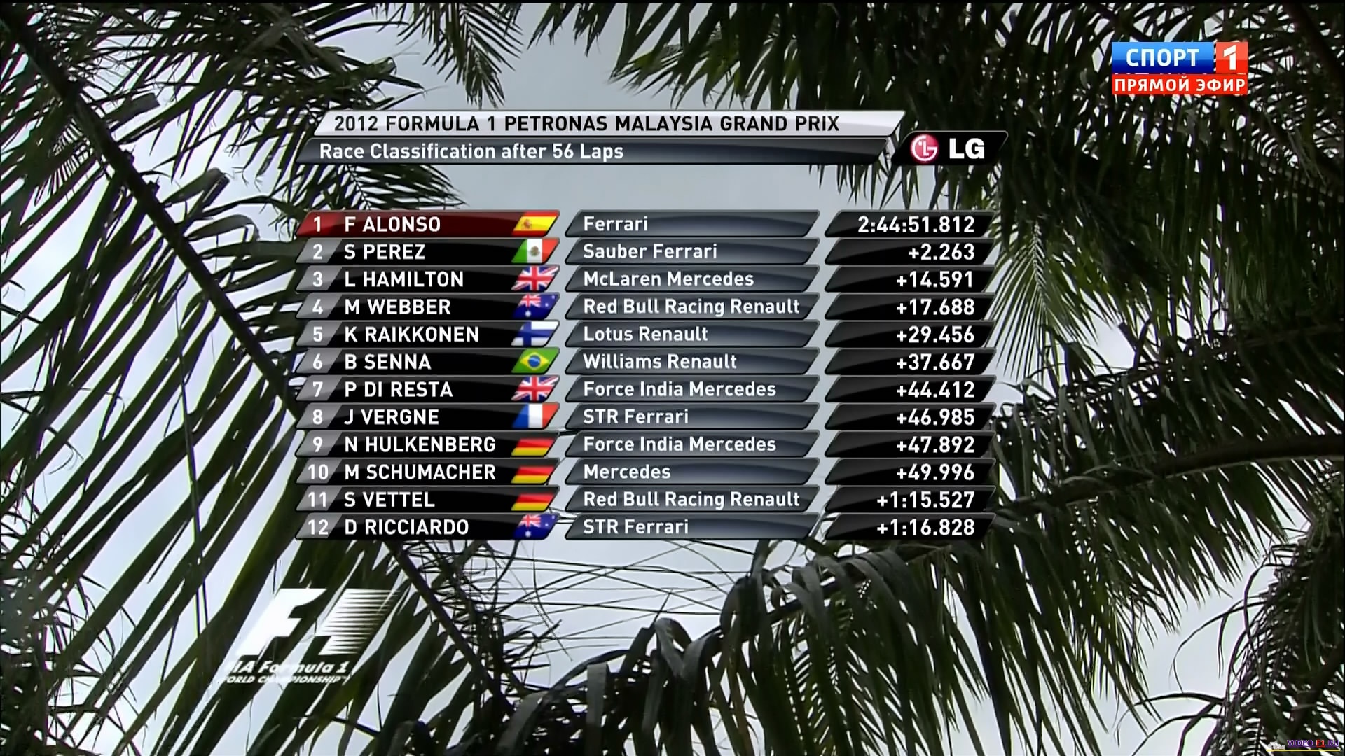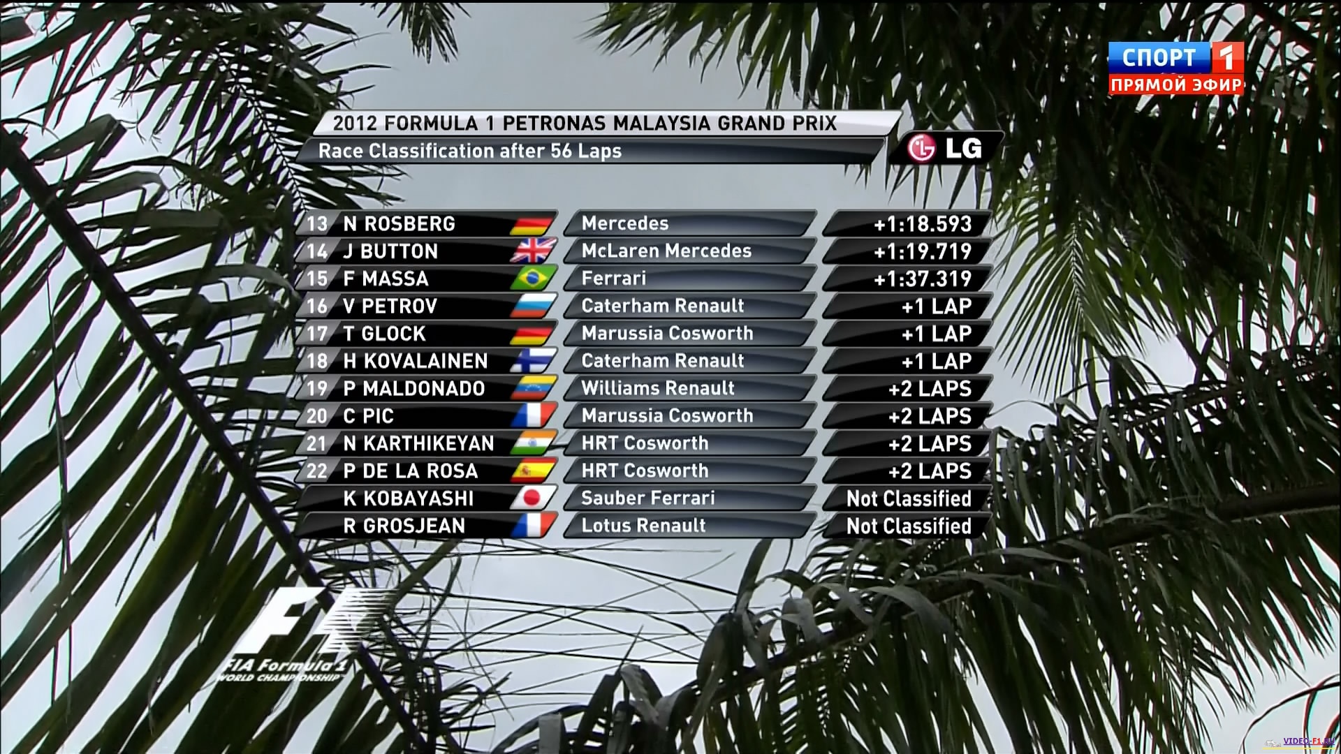 Формула-1 - 2012 - Этап 2 - гран-при Малайзия - Гонка в HD качествеФормула 1 - Гран-при Малайзия - ГОНКА - Скачать в хорошем HD Качестве Сезон 2012 года - Этап 2 (Куала-Лумпур, Сепанг, 25 марта 2012 года) 2012 FORMULA 1 PETRONAS MALAYSIA GRAND PRIX Round 1 - Malaysia - Kuala Lumpur (Sepang International Circuit) - HD RACE Гран-при Малайзии (Сепанг) - Гонка - скачать видео гонки в высоком качестве фото Мы снова с вами вместе с трассы Сепанг Арена гран при Малайзии. Всего 400 км отделают Сепанг от экватора и всего 50 км от Куала-Лумпура. Трасса Сепанг или как ее еще называют "Крылья бабочки" - которые раскрылись здесь в 1999 году и вьот уже в 14-й раз принимают у себя этап чемпионата мира гонок Формулы-1. Старт ожидался после небольшого дождя, трасса сухая, но достаточно скользская. Старт гонщики выбрали на промежуточном типе резине. ДОЖДЕВАЯ ГОНКА!!! Посмотреть бесплатно 3 минутный ролик самых интересных моментах в течении гонки гран-при Малайзии 2012 сезонаКанал: Спорт 1 Продолжительность: 3 часа 7 мин Комментарий: Русский (Алексей Попов) Размер файла: 13 Gb Формат: TS (HDTV) Видео: AVC, 1920x1080i, 25 fps, ~ 10000 kbps Аудио: MPEG Audio, 2 ch, 128 Kbps, 48 KHz ______ ___ __ _ _ Формула-1 гран-при Малайзии Гонка - Скачать видео 2012 года в высоком HD качестве (Без рекламы, одним файлом)(Download gran-prix Malaysia hd 1080i race) [sms_1] Ссылка на видео -> [/sms_1] Вы смотрите Формула-1 - 2012 - Этап 2 - гран-при Малайзия - Гонка в HD качестве