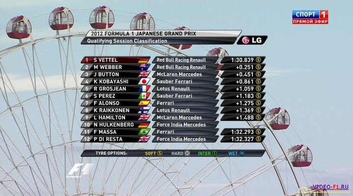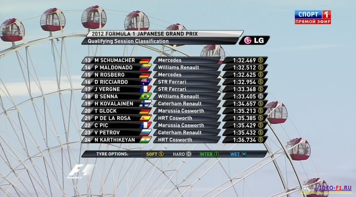 Формула-1 - 2012 - Этап 15 - гран-при Япония - КвалификацияФормула 1 - Гран-при Япония - КВАЛИФИКАЦИЯ - Скачать Сезон 2012 года - Этап 15 (Сузука, 6 октября 2012 года) 2012 FORMULA 1 JAPANESE GRAND PRIX Round 15 - Japan - Suzuka - Qualifying Гран-при Японии (Сузука) - Квалификация - скачать видео квала фото будет после квала.. квал добавлен! Канал: Россия 2 Продолжительность: 1 час 18 мин Комментарий: Русский (Алексей Попов, Наталья Фабричнова) Размер файла: 1 Gb Формат: AVI Видео: XviD, 720x400, 25.0fps, 1800kbps Аудио: MP3, 2 channels, stereo, 128kbps, 48000Hz ______ ___ __ _ _ Формула 1 2012 Япония Квалификация скачать видео в обычном SATRip качестве (Без рекламы, одним файлом)(Download gran-prix Japan 2012 qual) Вы смотрите Формула-1 - 2012 - Этап 15 - гран-при Япония - Квалификация