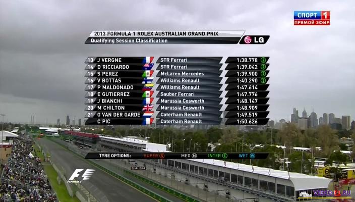Описание квала: Интересная дождевая квалификация, которая шла два дня!! Первая квалификация нового 2013 сезона на Арене в Австралии. 5 вечера по местному времени и на протяжении последних трех часов над Мельбурном идет дождь. Трасса отмечает 60 лет со дня первой гонки, которая была в 1953 году, это была вне зачетная гонка, она в официальной статистике не учитывается, но в австралийскую легенду она вошла. Тогда на старте было 40 машин. И тогда очень много машин сошло из-за перегрева, гонка была осенью. В этом году все типы резины стали еще на порядок мягче. Также появилось пять новых новичков. Команды HRT больше не существует. Вместо 24 пилотов, которые были на протяжении последних трех сезонов в этом году 22.