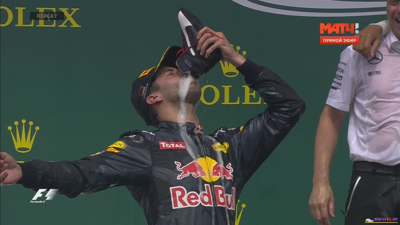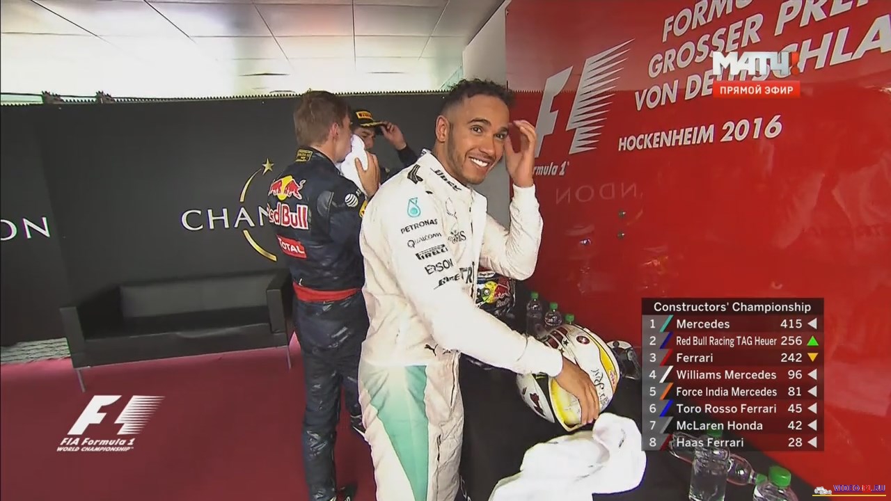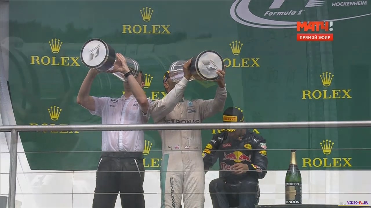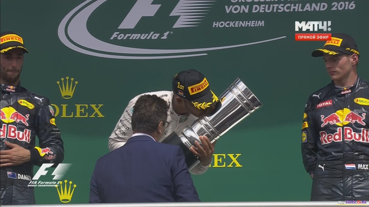 Формула 1 2016 Гран-при Германии ХокенхаймрингФормула 1 Этап 12 - Гран-При ГерманииГород и название трассы: Германия, Хокенхаймринг (о трассе) Дата гонки: 31 июля 2016 г Длина круга: 4,574 км Кол-во кругов: 67 Общая дистанция 306.458 км Комментатор на матч тв: Алексей Попов. (свободные заезды комментирует Владимир Башмаков) Что интересного было на гран-при Формулы 1 на трассе Хокенхаймринг, Обзор гонки 35-й раз проводится немецкий гран при Ф1 на Хоккенхаймринге. Начиная с этого гран-при больше нет ограничений на радио переговоры, кроме прогревочного круга. Австралиец Дэн Рикардо на подиуме пьет шампанское со своего ботинка Формула-1 - Результаты гран-при Германии 2016: Фотографии с уикенда Ф1 в Германии: Категории Формула 1 Сезон 2016 / Гран-При Германия