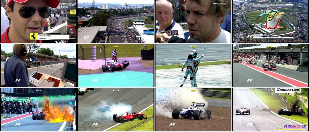 формула1 2009 гран-при Бразилия Сан-Пауло гонка Сразу после старта Райкконен теряет спойлер об Сутиля, последний который еще и сносит Трулли с трассы. Довольно уравновешенный Трулли после аварии не поленился пробежать пару сотен метров, чтобы по итальянски разобраться с Сутилем. А во время вынужденного пит стопа Райкконена, перед ним выскакивает с оторванным заправочным шлангом Макларен и все остатки топлива попадают Райкконену на шлем и его болид, и благодаря высоким температурам воспламеняются. Эффектное зрелище - горящий болид выезжающий с боксов.