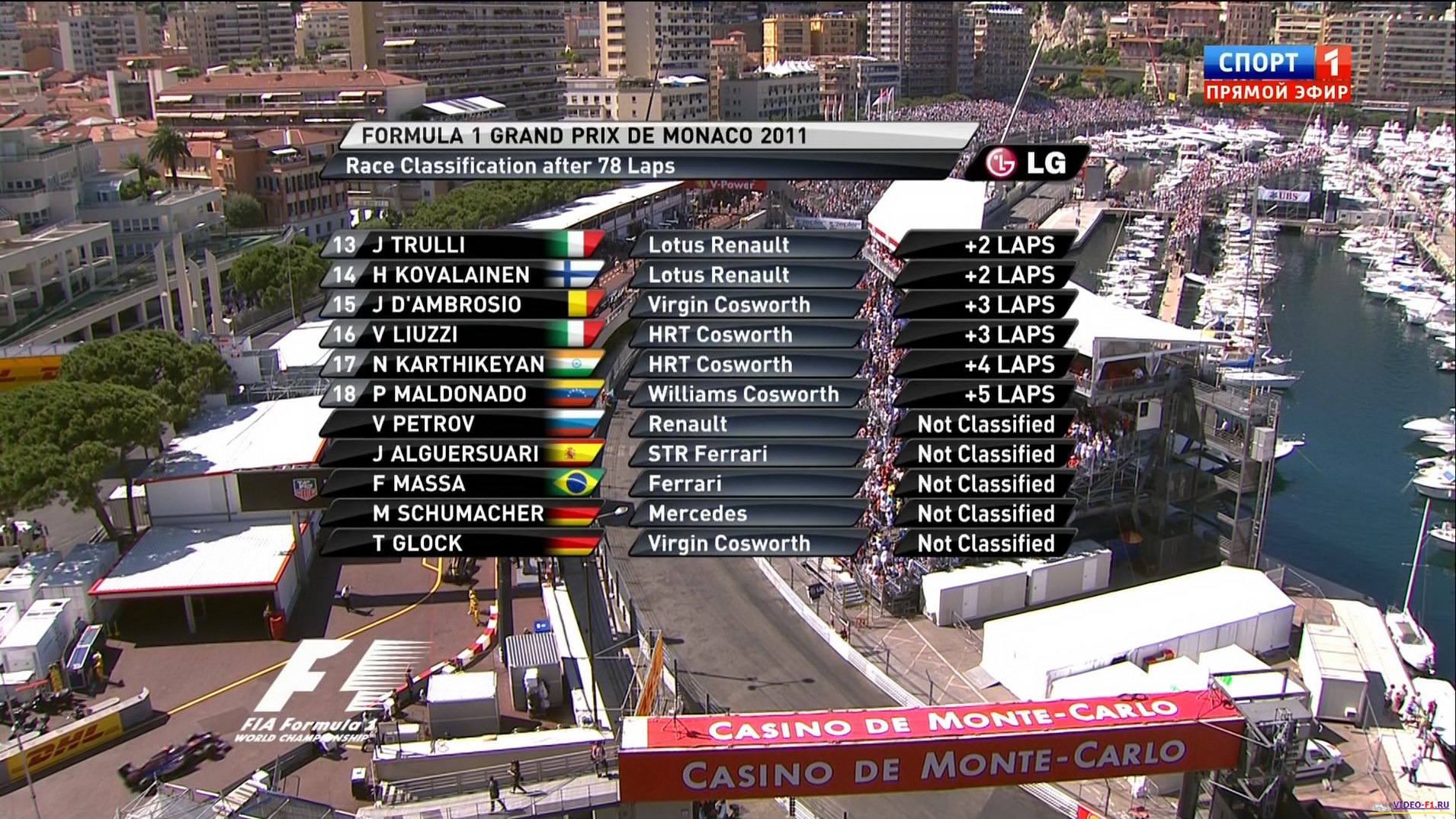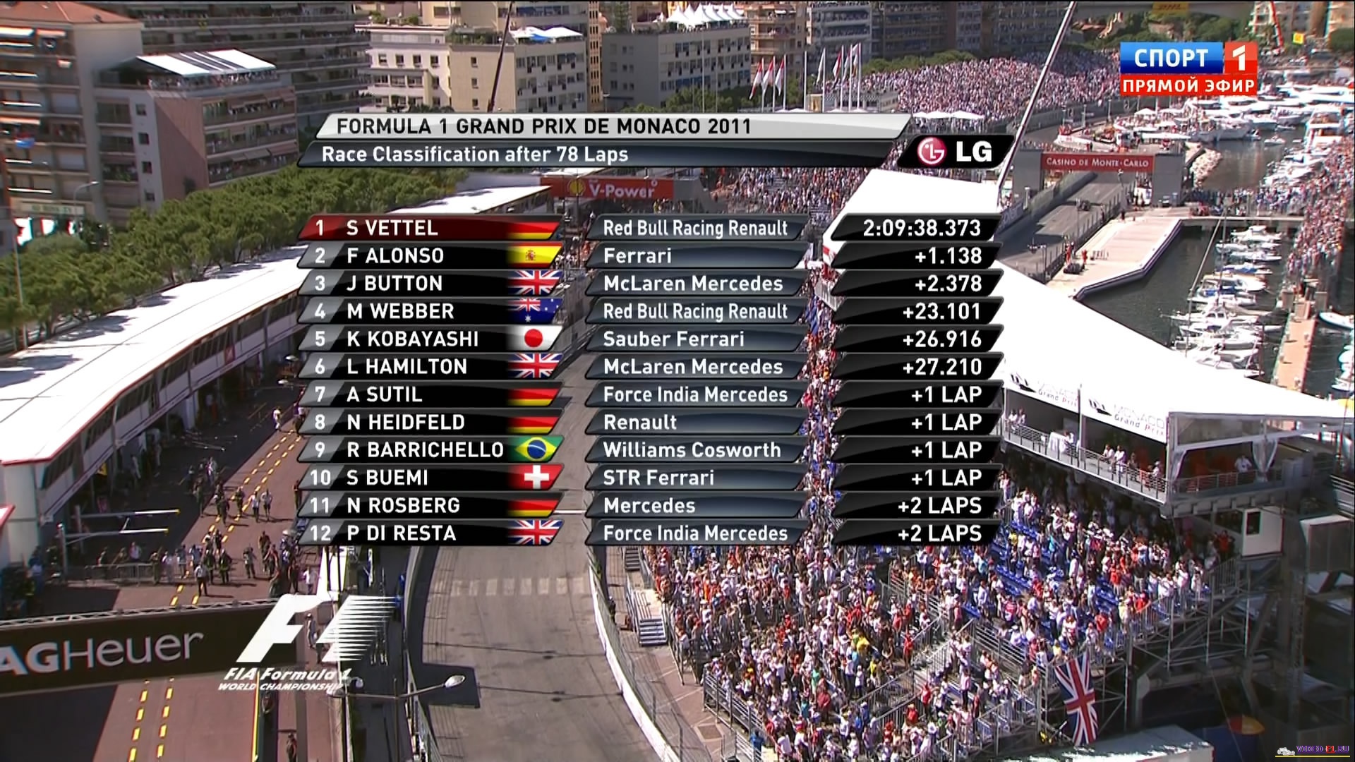 Формула 1 - 2011 - Этап 6 - гран-при Монако - Гонка в высоком качестве видео HDФормула 1 - Гран-при Монако - Гонка в высоком качестве HDСезон 2011 года - Этап 6 (Монте Карло, 29 мая 2011 года) FORMULA 1 GRAND PRIX DE MONACO 2011 Round 6 - Monte Carlo (Circuit de Monaco) - Race HD Video Гран-при Монако - Гонка - скачать видео в высоком качестве HD Гонка гран-при Монако в городе Монте-Карло добавлена для скачивания в высоком качестве HD видео 69 гран-при Монако в истории гонок Формулы-1, первая гонка была в 1929 году на этих улочках приморского Княжества, в котором выиграл Уилльям Грофф на болиде Бугатти. В честь него на трассе, на одном из поворотов стоит бронзовая скульптура. Очень опасная шикана на выходе из туннеля полностью переработана, после страшной аварии Тереса в квалификации. В этом шикане не мало гонщиков Формулы-1 погибло: в 1967 году сгорел Лоренсо Бандиния и через несколько дней скончался от последствий травмы, в 1955 году вылетел в воду Альберто Аскари, его подняли водолазы, но вскоре он тоже скончался. Монако это красиво и очень опасно! Гонка полна аварий, пейс-каров и два раза скорая выезжала на трассу забирать разбитых гонщиков.. Температура воздуха - 23 C Температура трассы - 43 C Влажность - 61 % Скорость ветра - 0.8 m/c Посмотреть бесплатно 3 минутный ролик самых интересных моментах в течении гонки гран-при Монако 2011 годаКанал: Спорт 1 Продолжительность: 2 часа 39 минут Комментарий: Русский (А. Попов) Размер файла: 11 Gb Формат: TS Видео: MPEG4 Video (H264) 1920x1080i (Interlaced) (16:9) 25.00fps ~9500 Kbps Аудио: MPEG1 - Layer 2, 48.0 kHz, 2 ch, stereo,128Kbps ______ ___ __ _ _ Скачать видео в высоком качестве HD гонки Формулы-1 - гонку гран-при Монако (Монте-Карло) 2011 года (Download formula-1 race video HD 1080i) Вы смотрите Формула 1 - 2011 - Этап 6 - гран-при Монако - Гонка в высоком качестве видео HD