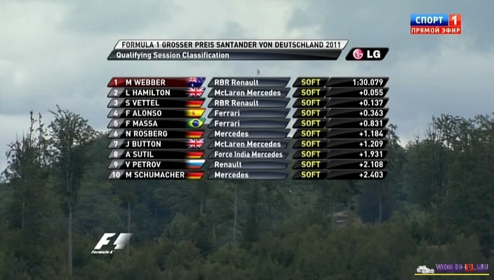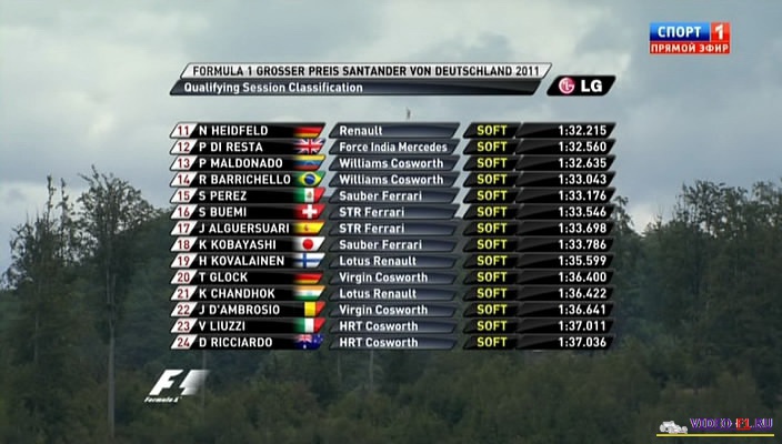 Формула 1 - 2011 - Этап 10 - гран-при Германии Нюргбургринг - КвалификацияФормула 1 - Гран-при Германия - КвалификацияСезон 2011 года - Этап 10 (Нюрбургринг, 23 июля 2011 года) FORMULA 1 GROSSER PREIS SANTANDER VON DEUTSCHLAND 2011 Round 10 - Nurburgring - Qualifying Гран-при Германия (Нюрбургринг) - Квалификация - скачать видео квала Квалификация в обычном качестве гран-при Германии в городе Нюрбургринг добавлена для скачивания 24 июля 2011 года Температура воздуха - 14 C Температура трассы - 22 C Влажность - 40% Скорость ветра - 6.8 m/c Канал: Спорт 1 Продолжительность: 1 час 19 мин Комментарий: Русский (А. Попов) Размер файла: 1 Gb Формат: AVI Видео: 704x400(16:9), 25.000 fps, 1700 kbps Аудио: MP3, 48 kHz, 2 ch, 128.00 kbps (гонку в высоком HD качестве (размером около 10 Gb) можно скачать - Здесь) (гонку в обычном качестве (размером около 1 Gb) можно скачать - Здесь) ______ ___ __ _ _ Скачать видео обычного качества квалификации Формулы-1 - квалификацию гран-при Германия (Нюрбургринг) 2011 года (Download qual gran-prix Germany) Вы смотрите Формула 1 - 2011 - Этап 10 - гран-при Германии Нюргбургринг - Квалификация