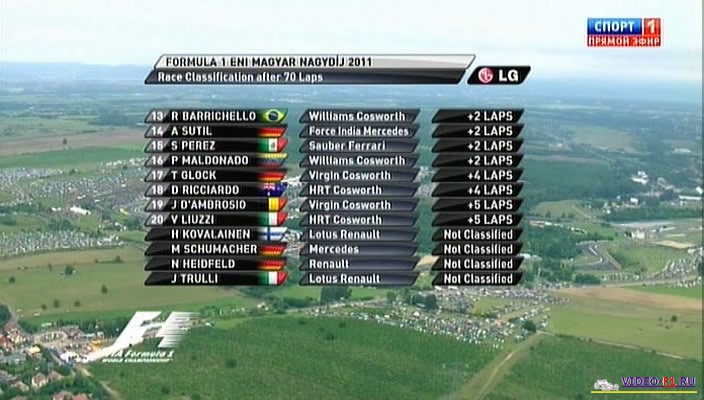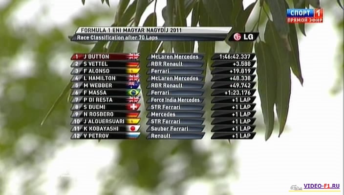 Формула 1 - 2011 - Этап 11 - гран-при ВенгрияФормула 1 - Гран-при Венгрия - Гонка - СкачатьСезон 2011 года - Этап 11 (Будапешт, Хунгароринг, 31 июля 2011 года) FORMULA 1 ENI MAGYAR NAGYDÍJ 2011 Round 11 - Hungary - Budapest - Hungaroring - Race Гран-при Венгрии (Хунгароринг) - Гонка - скачать видео гонки фото позже Гонка в обычном качестве гран-при Венгрии в городе Будапешт добавлена для скачивания 1 августа 2011 года Температура воздуха - 17 С Температура трассы - 18 С Влажность - 81% Скорость ветра - 5.1 m/s Посмотреть бесплатно 3 минутный ролик самых интересных моментах в течении гонки гран-при Венгрии 2011 годаКанал: Спорт 1 Продолжительность: 2 часа 22 минуты Комментарий: Русский (Алексей Попов) Размер файла: 1.8 Gb Формат: AVI Видео: XviD MPEG-4; 1650kbps; 704x400 25 fps Аудио: MP3; 2 ch; 128.00 kbps; 48 kHz (гонку в высоком HD качестве (размером около 10 Gb) можно скачать - Здесь) (квалификацию можно скачать - Здесь) ______ ___ __ _ _ Скачать видео гонки Формулы-1 - гонку гран-при Венгрии (Хунгароринг) 2011 года в обычном качестве (Download race gran-prix Hungary) Вы смотрите Формула 1 - 2011 - Этап 11 - гран-при Венгрия
