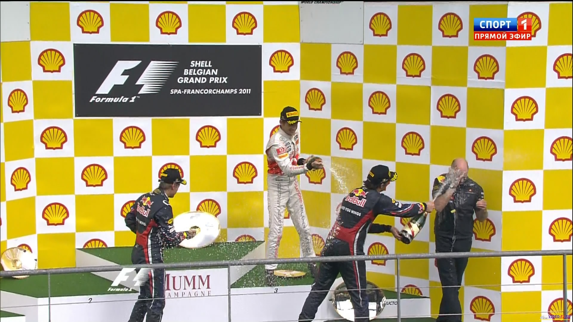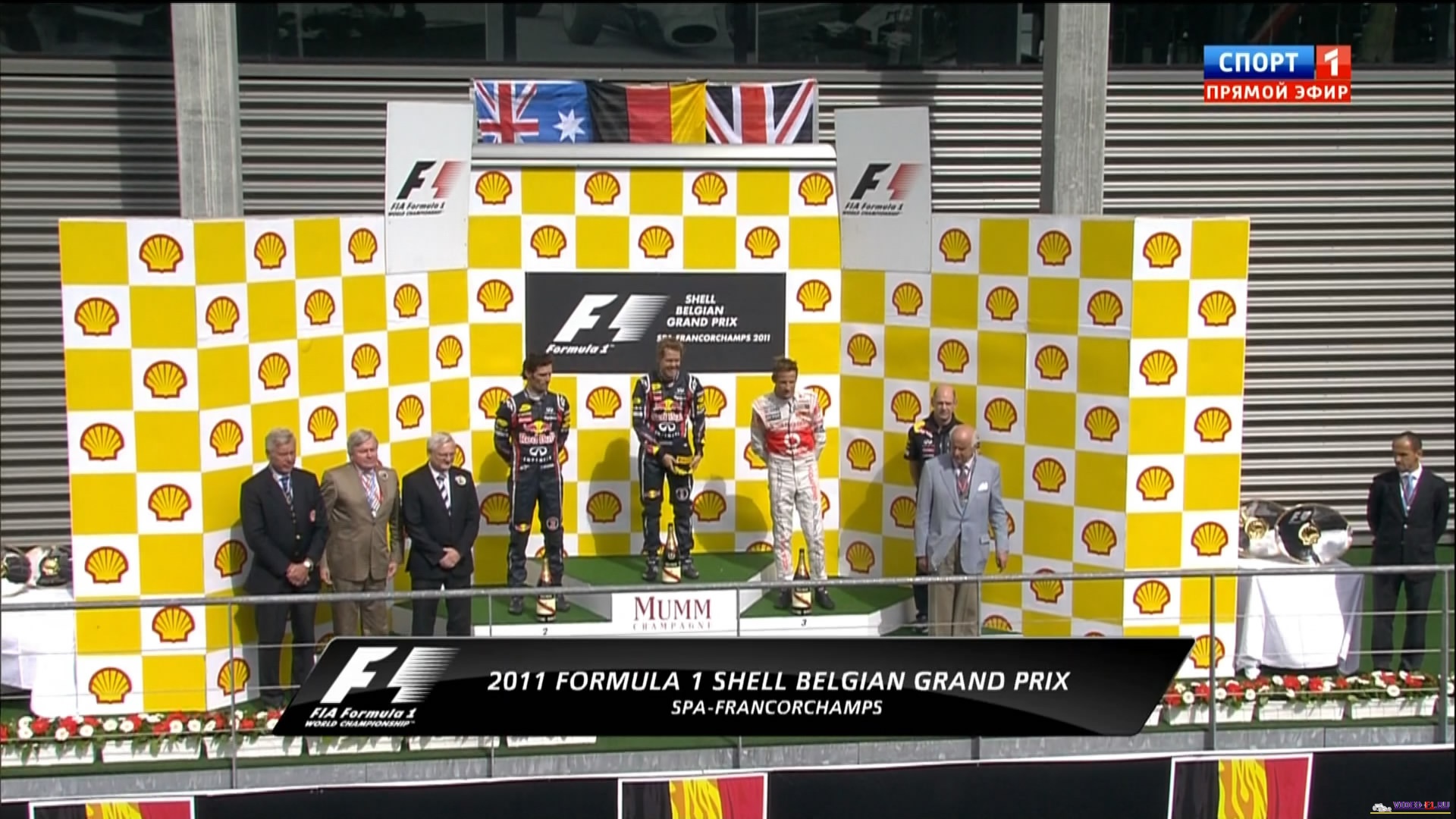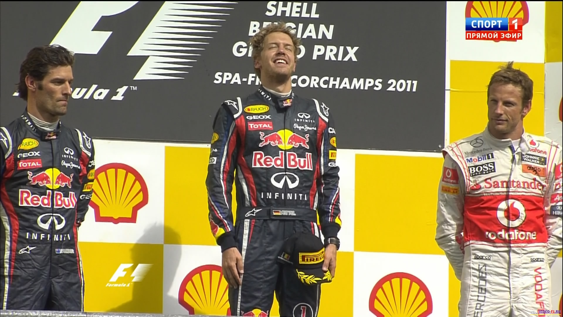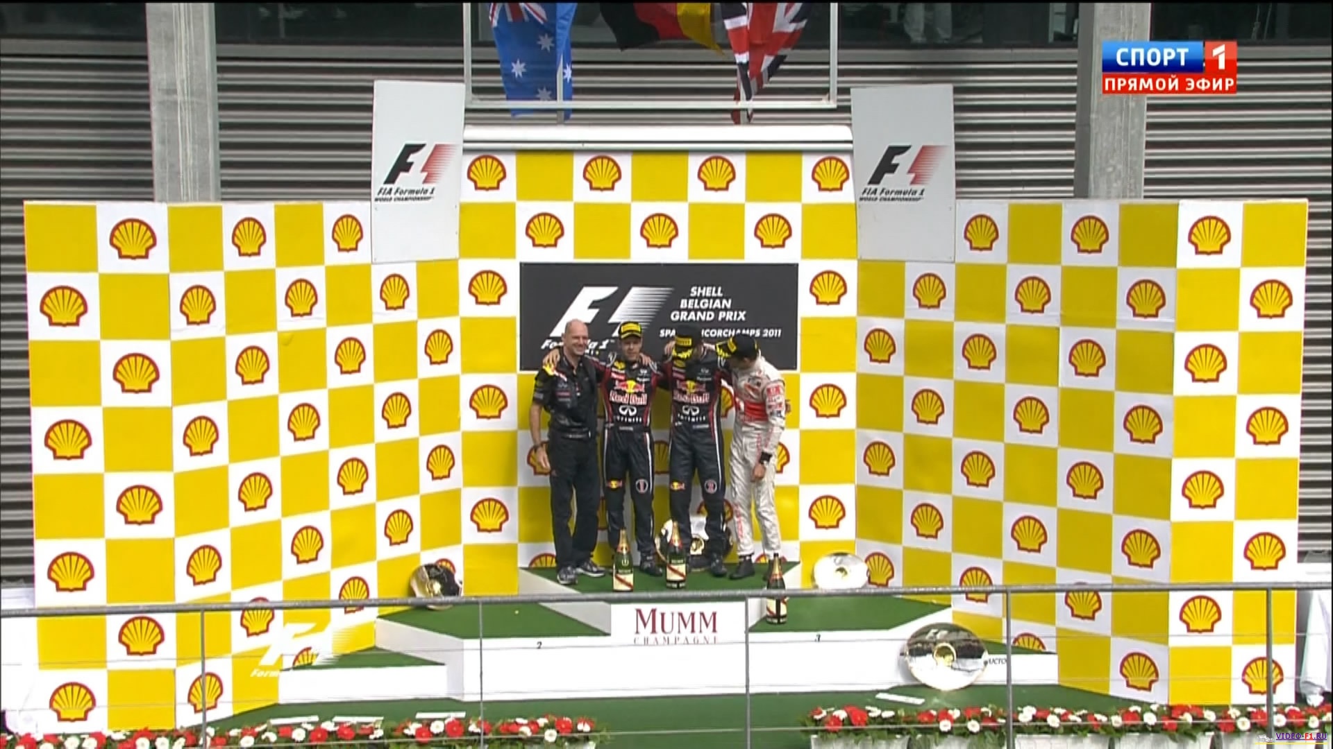 Победители двенадцатой гонки Формулы-1 Гран-При Спа Франкошамп 2011 - Церемония награждения: Первый болид Ред Булл, Формула-1, Формула-1, Гран при Бельгия 2011 годФеттель на болиде празднует свою 17-ю победу, Гран при Бельгия 2011 годПоздравление Феттеля от команды, Формула-1, Формула-1, Гран при Бельгия 2011 годВиталий Петров кое как доехал накатом до финиша, пропустив перед финишом Массу, Гран при Бельгия 2011 годКорридор бельгийских девочек, Формула-1, Гран при Бельгия 2011 годПобедители Себастьян Феттель, Марк Веббер и Джейсон Баттон на пьедестале, Формула-1, Гран при Бельгия 2011 годПобедитель Феттель слушает немецкий гимн, Формула-1, Гран при Бельгия 2011 годПапа Себастьяна Феттеля, Формула-1, Гран при Бельгия 2011 годОригинальный кубок победителям, Формула-1, Гран при Бельгия 2011 годЯпонская подруга Джейсона Баттона, Формула-1, Гран при Бельгия 2011 годМарк Веббер жестоко обильно и с радостью босса команды за то, что ему продлили контракт на следующий год, Формула-1, Гран при Бельгия 2011 годФото на память, Формула-1, Гран при Бельгия 2011 годУбитый задний спойлер на болиде Джейсона Баттона, Формула-1, Гран при Бельгия 2011 год