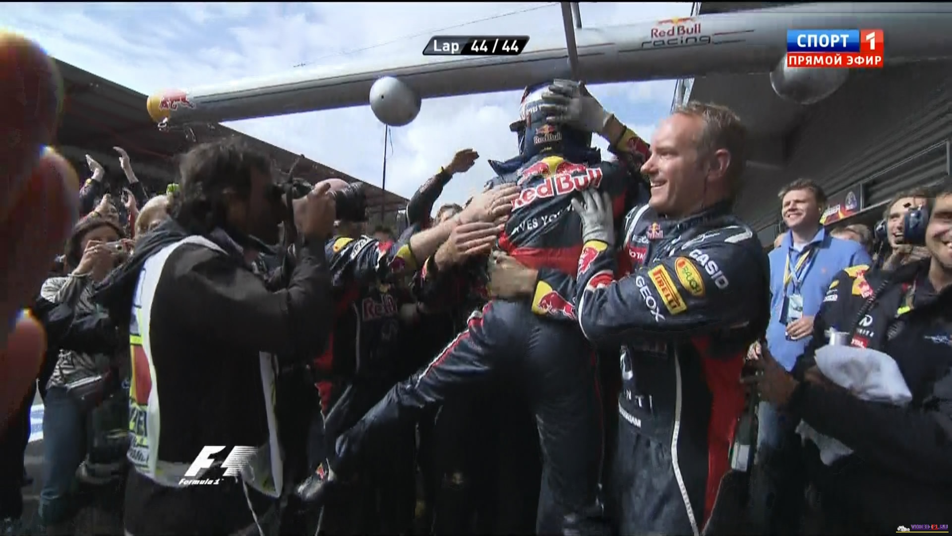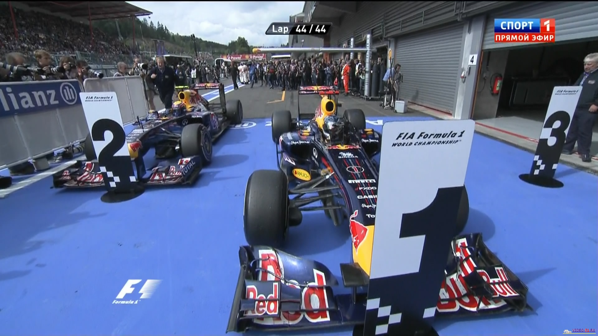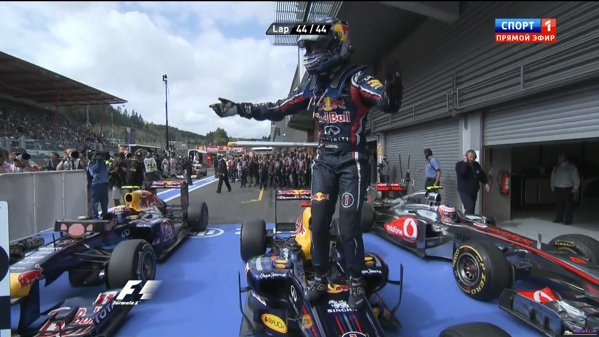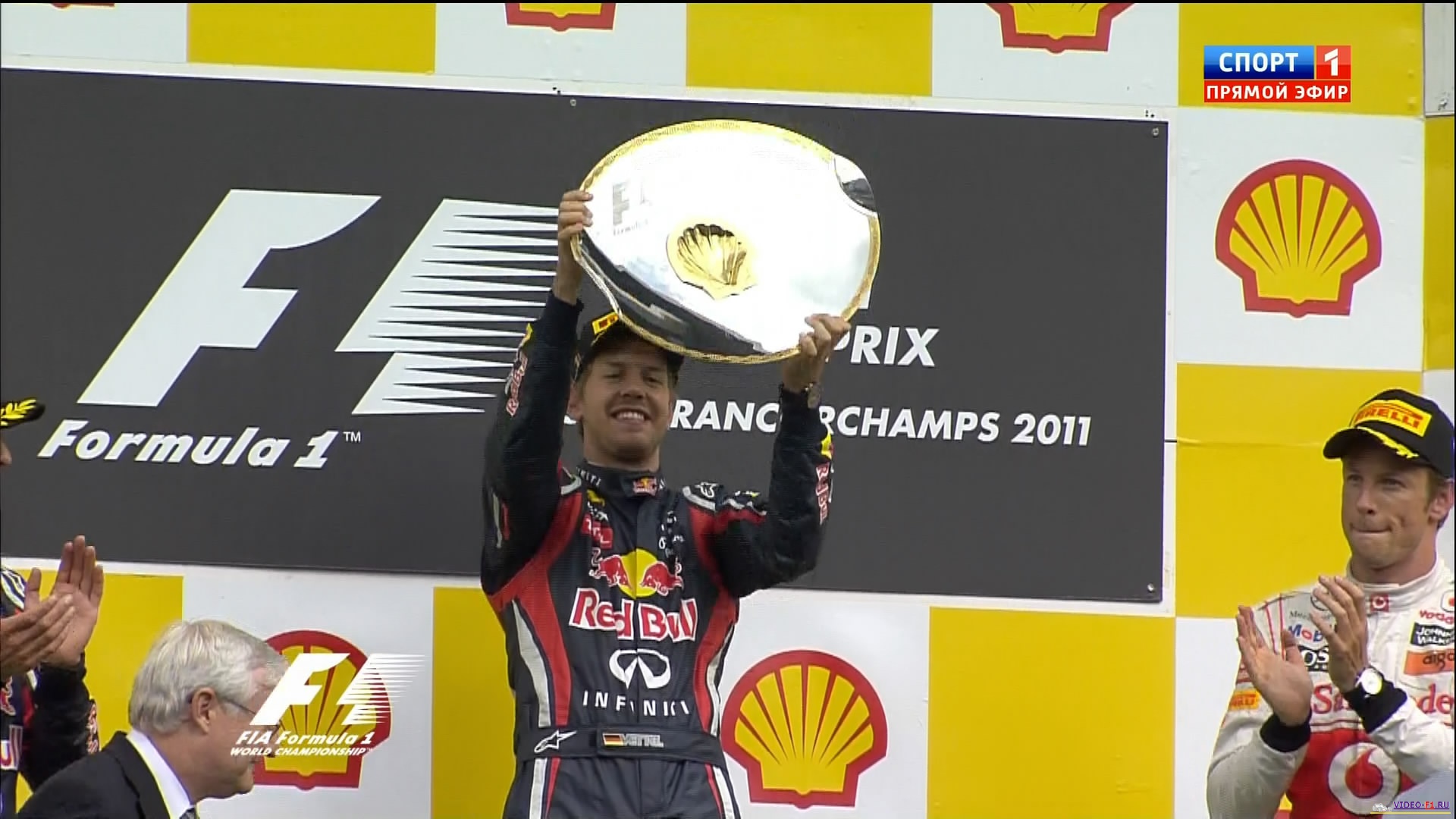 Победители двенадцатой гонки Формулы-1 Гран-При Спа Франкошамп 2011 - Церемония награждения: Первый болид Ред Булл, Формула-1, Формула-1, Гран при Бельгия 2011 годФеттель на болиде празднует свою 17-ю победу, Гран при Бельгия 2011 годПоздравление Феттеля от команды, Формула-1, Формула-1, Гран при Бельгия 2011 годВиталий Петров кое как доехал накатом до финиша, пропустив перед финишом Массу, Гран при Бельгия 2011 годКорридор бельгийских девочек, Формула-1, Гран при Бельгия 2011 годПобедители Себастьян Феттель, Марк Веббер и Джейсон Баттон на пьедестале, Формула-1, Гран при Бельгия 2011 годПобедитель Феттель слушает немецкий гимн, Формула-1, Гран при Бельгия 2011 годПапа Себастьяна Феттеля, Формула-1, Гран при Бельгия 2011 годОригинальный кубок победителям, Формула-1, Гран при Бельгия 2011 годЯпонская подруга Джейсона Баттона, Формула-1, Гран при Бельгия 2011 годМарк Веббер жестоко обильно и с радостью босса команды за то, что ему продлили контракт на следующий год, Формула-1, Гран при Бельгия 2011 годФото на память, Формула-1, Гран при Бельгия 2011 годУбитый задний спойлер на болиде Джейсона Баттона, Формула-1, Гран при Бельгия 2011 год