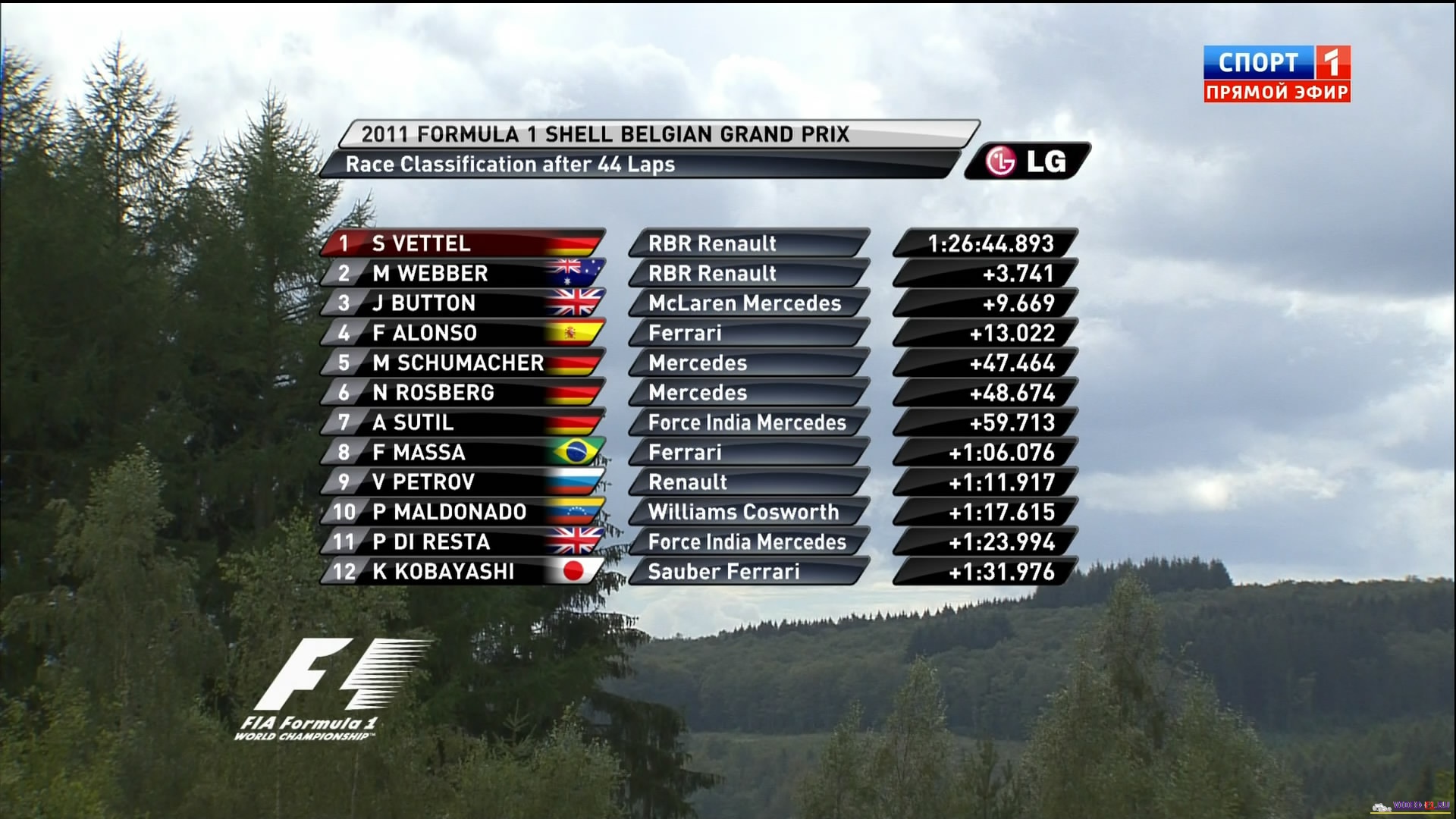 Таблица результатов гонки гран-при Бельгии сезона 2011 года Результаты заезда, Формула-1, Гран при Бельгия 2011 год