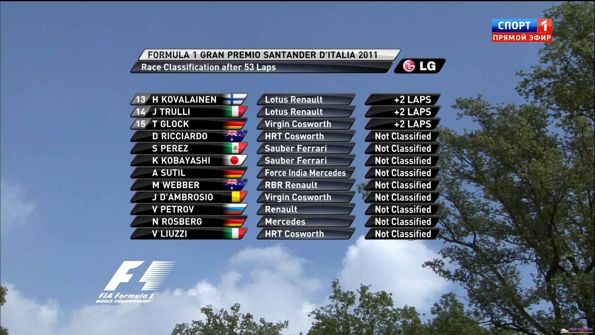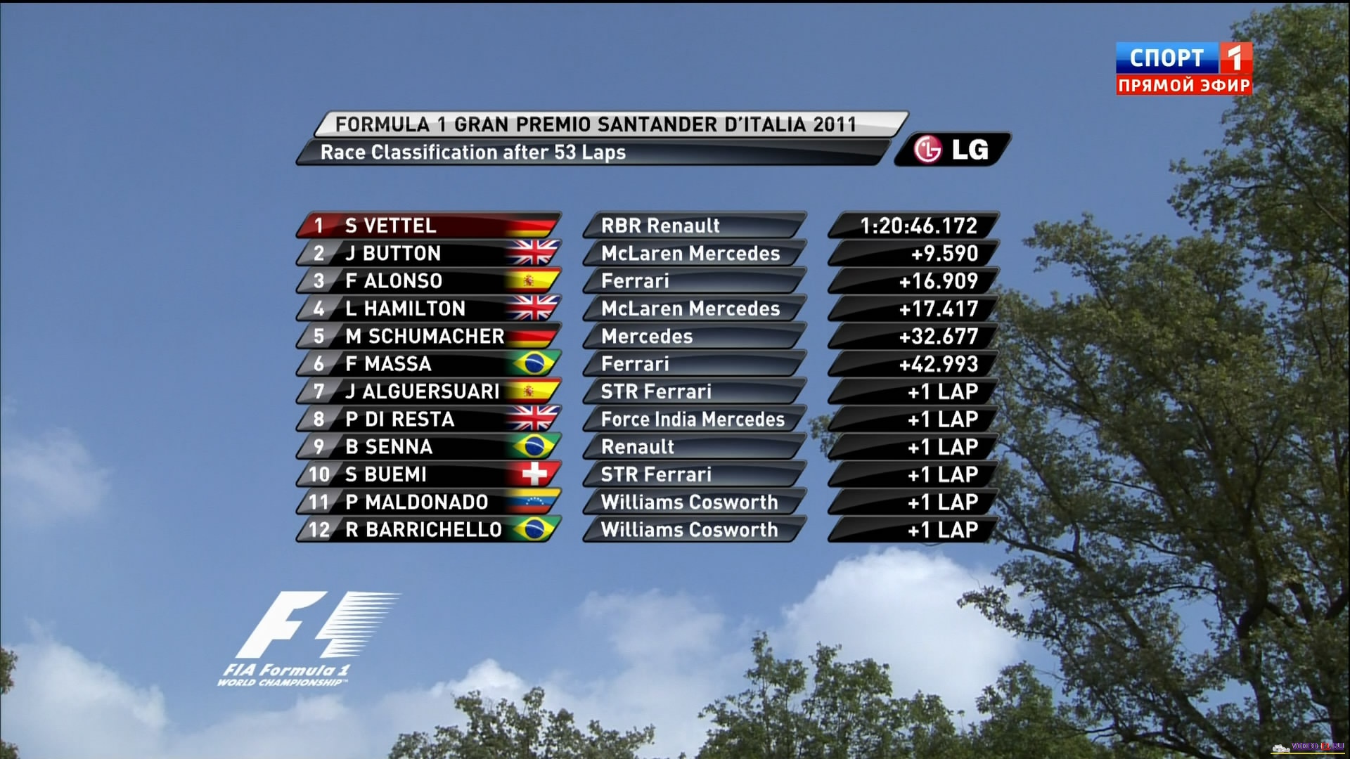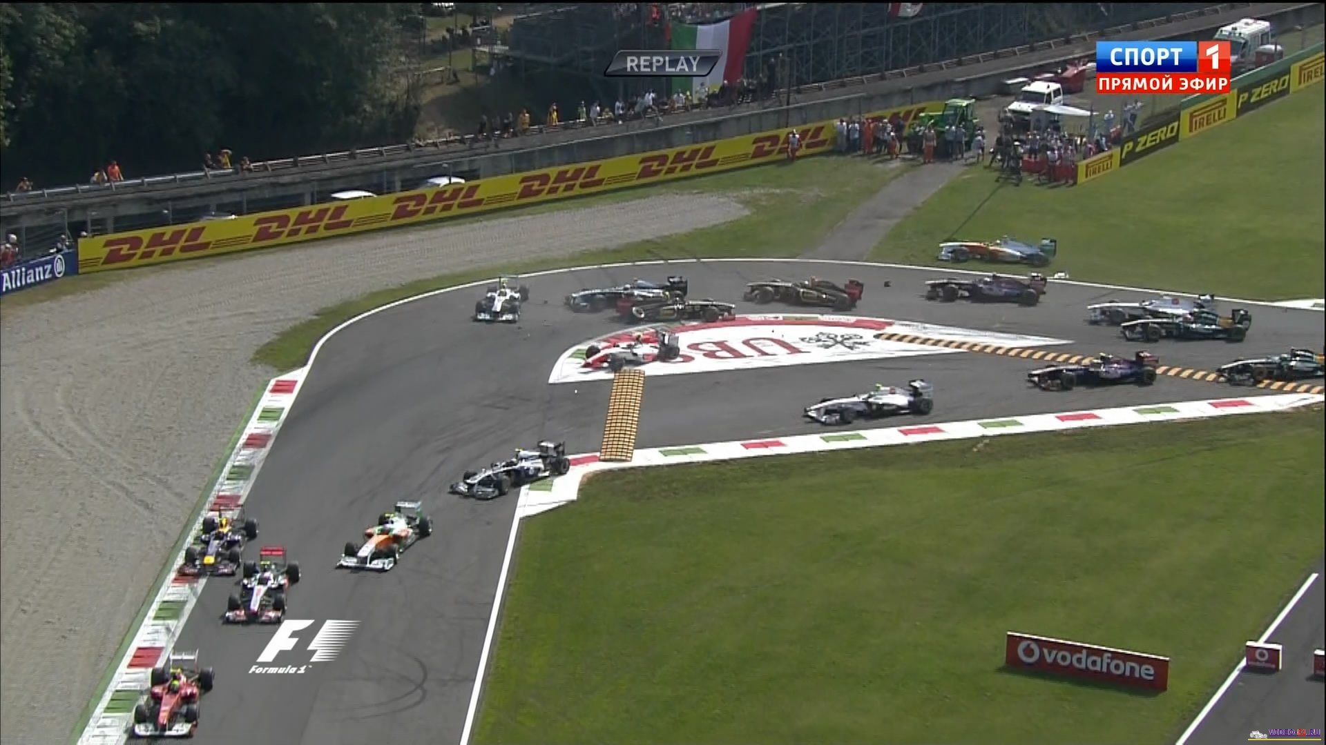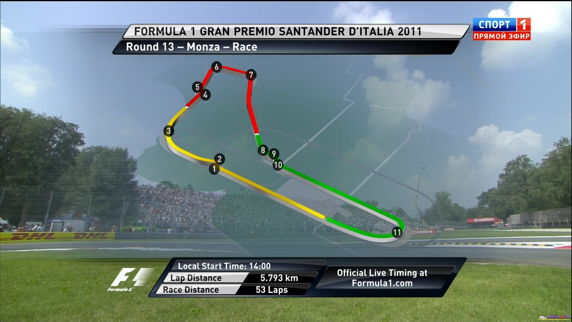 Формула 1 - 2011 - Этап 13 - гран-при Италия Монца - ГонкаФормула 1 - Гран-при Италия - Гонка - Скачать видеоСезон 2011 года - Этап 13 (Монца, 11 сентября 2011 года) FORMULA 1 GRAN PREMIO SANTANDER D'ITALIA 2011 Round 13 - Italy - Monza - Race Video Гран-при Италии (Монца) - Гонку - скачать видео гонки в обычном качестве Гонка в обычном качестве гран-при Италии в на трассе Монца добавлена для скачивания 11 сентября 2011 года Температура воздуха - 29С Температура трассы - 41С Влажность - 48% Скорость ветра - 1.8 м/с Посмотреть бесплатно 3 минутный ролик самых интересных моментах в течении гонки гран-при Италии 2011 годаКанал: Спорт 1 Продолжительность: 2 часа 19 минут Комментарий: Русский (Алексей Попов) Размер файла: 1.7 Gb Формат: AVI Видео: XviD MPEG-4; 1650kbps; 704x400 0.24 bit/pixel; 25 fps Аудио: MP3; 2 ch; 128.00 kbps; 48 kHz (гонку в HD качестве (размером около 10 Gb) можно скачать - Здесь) (квалификацию можно скачать - Здесь) ______ ___ __ _ _ Скачать видео гонки Формулы-1 - гонку гран-при Италия (Монца) 2011 года в обычном качестве (Без рекламы, одним файлом)(Download gran-prix Italia Monza race) Вы смотрите Формула 1 - 2011 - Этап 13 - гран-при Италия Монца - Гонка