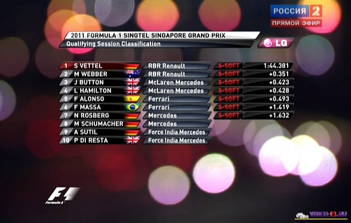 Формула 1 - 2011 - Этап 14 - гран-при Сингапур - КвалификацияФормула 1 - Гран-при Сингапур - КвалификацияСезон 2011 года - Этап 14 (Городская ночная трасса Марина Бай, 24 сентября 2011 года) 2011 FORMULA 1 SINGTEL SINGAPORE GRAND PRIX Round 14 - Singapore - Marina Bay Street Circuit - Qualifying Гран-при Сингапур (Марина Бэй) - КВАЛИФИКАЦИЯ фото Квал в обычном качестве гран-при Сингапура на городской ночной трассе Марина Бэй добавлен для скачивания 24 сентября 2011 года Температура воздуха - 30 С Температура трассы - 31 С Влажность - 70% Скорость ветра - 2,8 м/с Канал: Спорт 1 Продолжительность: 1 час 10 мин Комментарий: Русский (Алексей Попов) Размер файла: 1 Gb Формат: AVI Видео: 704x448 (1.57:1), 25 fps, XviD MPEG-4 ~1799 kbps Аудио: 48 kHz, MP3, 2 ch, ~128.00 kbps (гонку в обычном качестве (размером около 2 Gb) можно скачать - Здесь) (гонку в высоком HD качестве (размером около 10 Gb) можно скачать - Здесь) ______ ___ __ _ _ Скачать видео квалификации - квал гран-при Формула 1 Сингапур (Марина Бэй) 2011 года в обычном качестве (Без рекламы, одним файлом)(Download formula 1 Singapore qual ) Вы смотрите Формула 1 - 2011 - Этап 14 - гран-при Сингапур - Квалификация