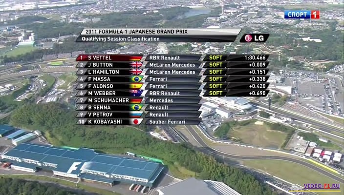 Формула 1 - 2011 - Этап 15 - гран-при Япония Сузука - КвалификацияФормула 1 - Гран-при Япония - Квалификация - СкачатьСезон 2011 года - Этап 15 (Сузука, 8 октября 2011 года) 2011 FORMULA 1 JAPANESE GRAND PRIX Round 15 - Japan - Suzuka - Qualyfing Video Гран-при Япония (Сузука) - КВАЛИФИКАЦИЯ - скачать Квалификация гран-при Японии на трассе в Сузука добавлена для скачивания 9 октября 2011 года Температура воздуха - 23 С Температура трассы - 36 С Влажность - 40% Скорость ветра - 1.6 м/с Канал: Спорт 1 Продолжительность: 1 час 6 мин Комментарий: Русский (Алексей Попов) Размер файла: 0.8 G Формат: AVI Видео: 704x400 (1.76:1), 25 fps, XviD build 50 ~1597 kbps avg Аудио: 48 kHz, MP3, 2 ch, ~128.00 kbps avg (гонку в обычном качестве (размером около 2 Gb) можно скачать - Здесь) (гонку в высоком HD качестве (размером около 10 Gb) можно скачать - Здесь) ______ ___ __ _ _ Скачать видео квалификации Формулы-1 - квал гран-при Японии (Сузука) 2011 года в обычном качестве SATRip (Без рекламы, одним файлом)(Download gran-prix Japan (Suzuka) qual) Вы смотрите Формула 1 - 2011 - Этап 15 - гран-при Япония Сузука - Квалификация