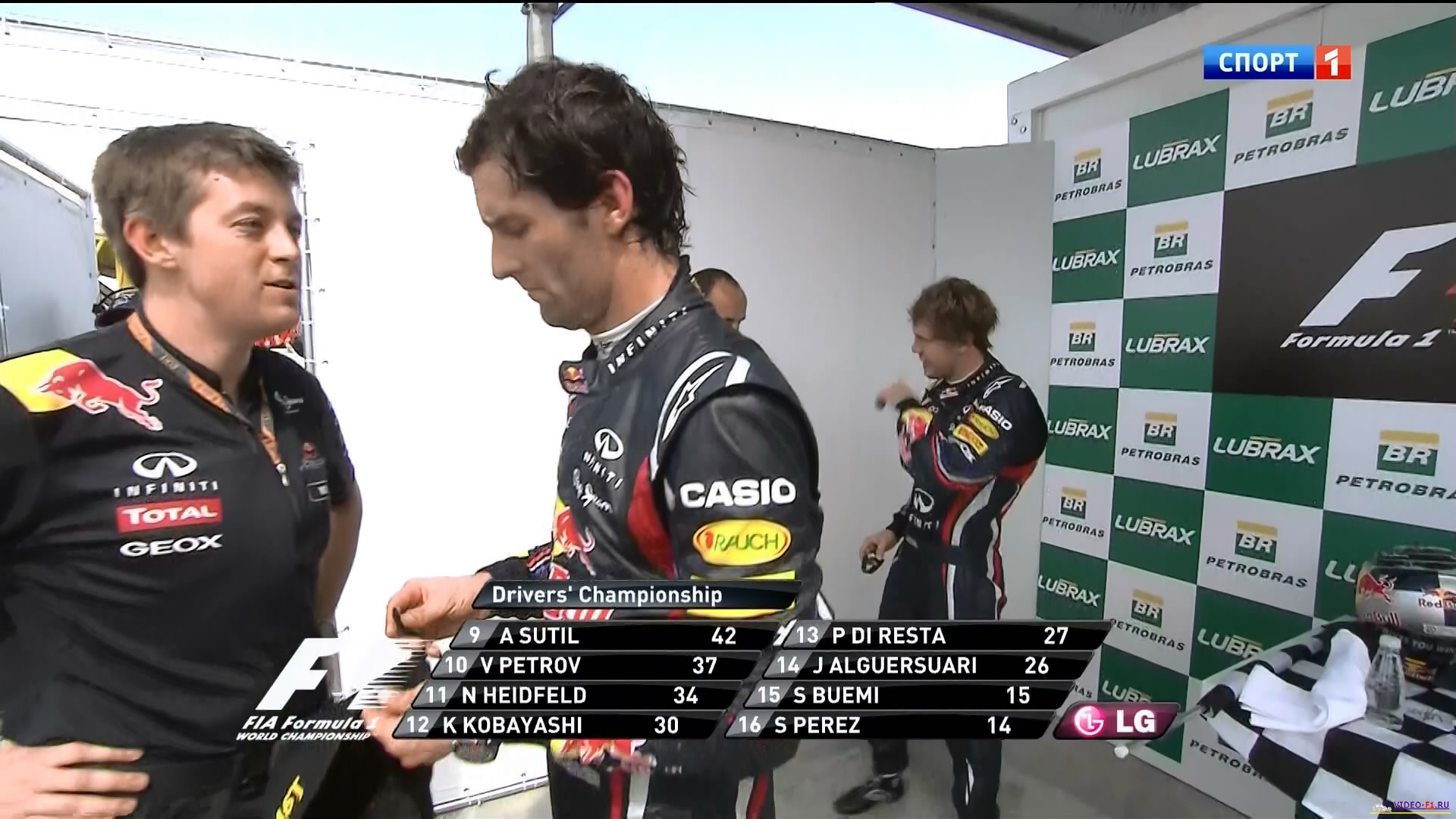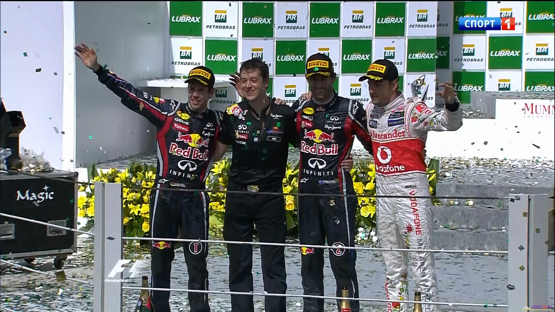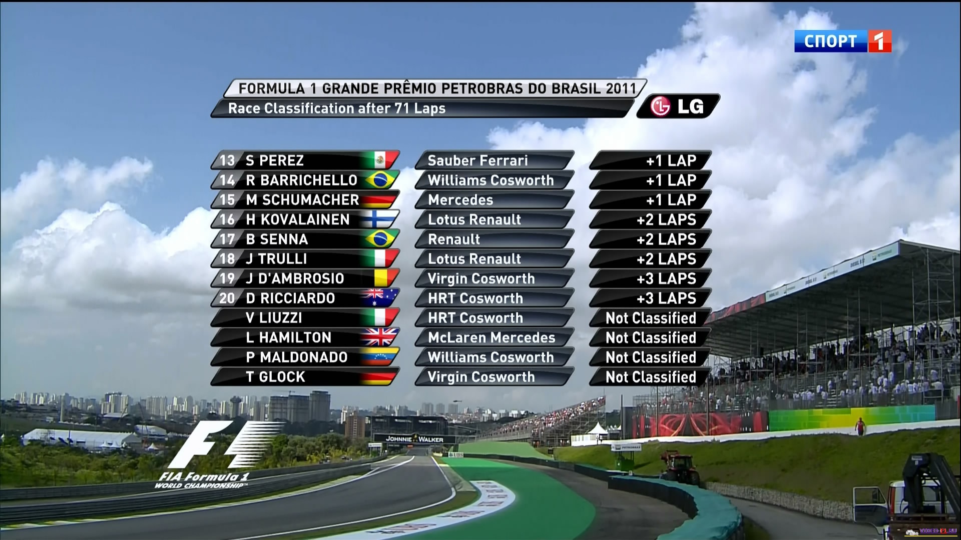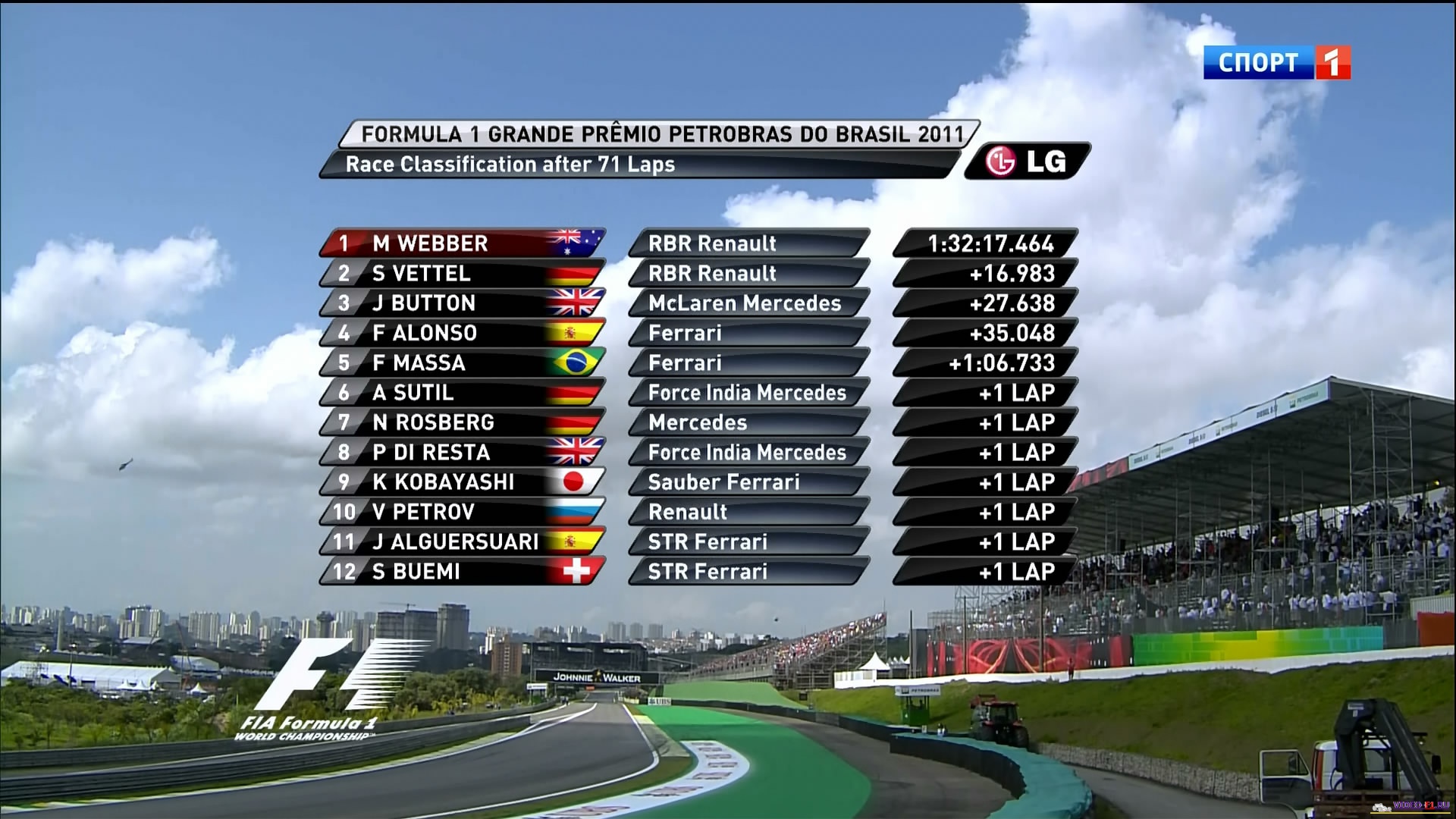 Формула 1 - 2011 - Этап 19 - гран-при Бразилия - ГонкаФормула 1 - Гран-при Бразилия - ГОНКА - СкачатьСезон 2011 года - Этап 19 (Сан Паоло Интерлагос, 27 ноября 2011 года) FORMULA 1 GRANDE PRÊMIO PETROBRAS DO BRASIL 2011 Round 19 - Brasil - Sao Paolo - RACE Гран-при Бразилии (Интерлагос) - Гонка - скачать видео гонки Температура воздуха - 25C Температура трассы - 46C Влажность - 58% Скорость ветра - 4.9 m/s Посмотреть бесплатно 3 минутный ролик самых интересных моментах в течении гонки гран-при Бразилии 2011 годаКанал: Спорт 1 Продолжительность: 1 час 55 мин Комментарий: Русский (Алексей Попов) Размер файла: 1.55 Gb Формат: AVI Видео: 704x448 (1.57:1), 25 fps, ~1798 kbps avg Аудио: MP3, 48 kHz, 2 ch, 128.00 kbps ______ ___ __ _ _ Скачать видео Формулы-1 - последнюю гонку 2011 сезона, гран-при Бразилии 2011 года в обычном SATRip качестве (Без рекламы, одним файлом)(Download gran-prix Brasil race) [sms_1] Ссылка на видео -> СКАЧАТЬ После открытия нажать DOWNLOAD и выбрать путь сохранения файла. [/sms_1] Вы смотрите Формула 1 - 2011 - Этап 19 - гран-при Бразилия - Гонка