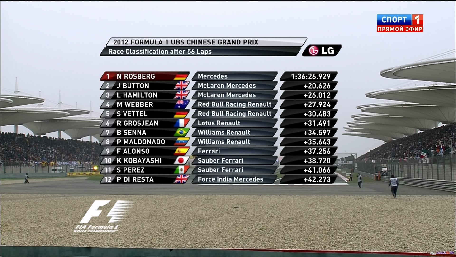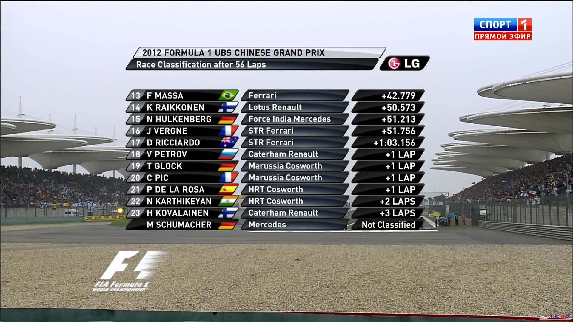 Формула-1 - 2012 - Этап 3 - гран-при Китай - ГонкаФормула 1 - Гран-при Китай - ГОНКА - Скачать Сезон 2012 года - Этап 3 (Шанхай, 15 апреля 2012 года) 2012 FORMULA 1 UBS CHINESE GRAND PRIX Round 3 - China - Shanghai (Shanghai International Circuit) - Race Гран-при Китая (Шанхай) - Гонка - скачать видео гонки в обычном SATRip качестве Третий этап чемпионата мира 2012 года. В 9-й раз этот автодром в пригороде Джиадин примет у себя королевские гонки. С 2004 года и практически каждый раз вплоть до прошлого сезона побеждали разные люди. Даже больше того, практически все из них были чемпионами кроме Рубенса Барикелло. Единственного из победителей гран-при Китая, которого сейчас здесь нет на стартовой решетки. Он выступал вплоть до прошлого года, но затем отправился через океан и на трассе лонгбич в США примет участие в третьей своей жизни гонки Индикара. А все остальные здесь, начиная с победителя 2005 года, когда Фернандо Алонсо на пути к своему чемпионскому титулу.. Михаель Шумахер побеждал последний раз именно на этой гонке, 91-я его победа была в Китае и с тех пор он более не побеждал. Прошло уже 5 лет. Но на этот раз Михаель на первой линии стартового поля. В 2007 году выиграл Кимми Райконен, причем эта гонка тогда была в конце сезона. Единственный двукратный победитель гран-при Китая это Хэмильтон. Сверху трасса похоже на иероглиф (первый из двух), который составляет слово Шанхай. Читается Шань. Герман Тильке построил эту трассу на пустынном болотном месте, пришлось забить 40000 свай, причем некоторые доходили в глубину до 80 метров, только для того чтобы укрепить этот участок земли. Посмотреть бесплатно 3 минутный ролик самых интересных моментах в течении гонки гран-при Китая 2012 сезонаКанал: Спорт 1 Продолжительность: 2 часа 15 мин Комментарий: Русский (Алексей Попов) Размер файла: 1.9 Gb Формат: AVI Видео: XviD, 704x400, 25.0fps, 1800kbps Аудио: MP3, 2 channels, stereo, 128kbps, 48000Hz ______ ___ __ _ _ Формула-1 гран-при Китая Гонка - Скачать видео 2012 года в обычном SATRip качестве (Без рекламы, одним файлом)(Download gran-prix China 2012 race) [sms_1] Ссылка на видео -> [/sms_1] Вы смотрите Формула-1 - 2012 - Этап 3 - гран-при Китай - Гонка