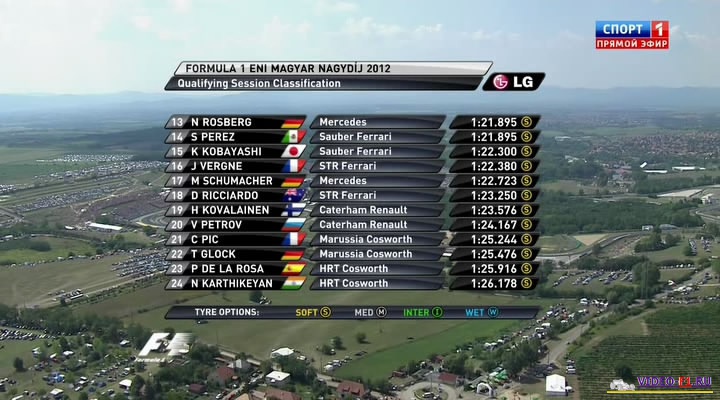 Формула-1 - 2012 - Этап 11 - гран-при Венгрия - КвалификацияФормула 1 - Гран-при Венгрия - КВАЛИФИКАЦИЯ - Скачать Сезон 2012 года - Этап 11 (Будапешт, Хунгароринг, 28 июля 2012 года) FORMULA 1 ENI MAGYAR NAGYDÍJ 2012 Round 11 - Budapest - Hungaroring - Qualifying Гран-при Венгрии (Хунгароринг) - Квалификация - скачать видео квала 14 поворотов венгерской трассы Канал: Спорт 1 Продолжительность: 1 час Комментарий: Русский (Алексей Попов и Наталья Фабричная) Размер файла: 0.8 Gb Формат: AVI Видео: XviD, 720x400, 25.0fps, 1800kbps Аудио: MP3, 2 ch, stereo, 128kbps, 48000H ______ ___ __ _ _ Формула-1 Венгрия Квалификация - Скачать видео 2012 года в обычном SATRip качестве (Без рекламы, одним файлом)(Download gran-prix Hungary 2012 qual) Вы смотрите Формула-1 - 2012 - Этап 11 - гран-при Венгрия - Квалификация