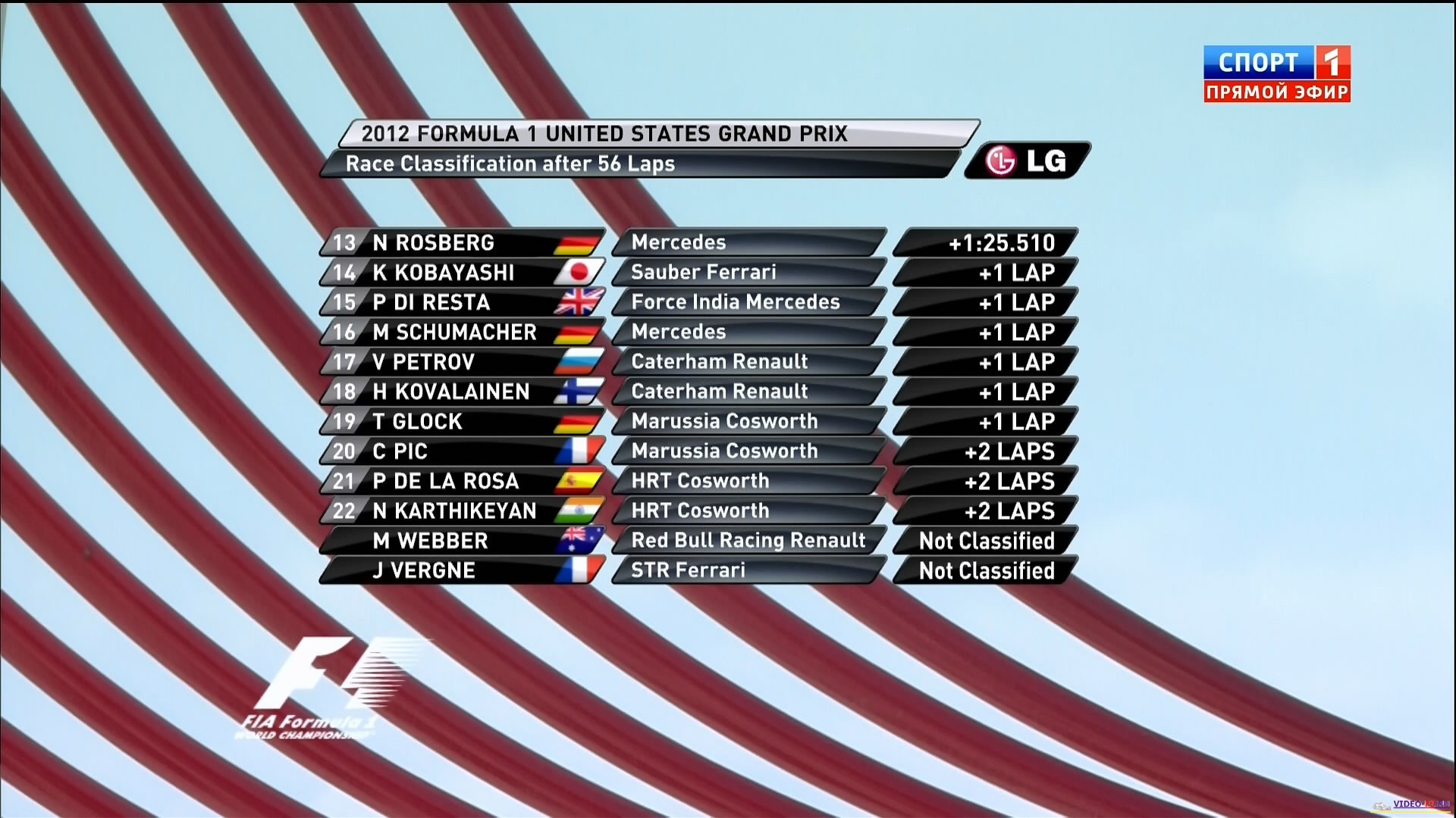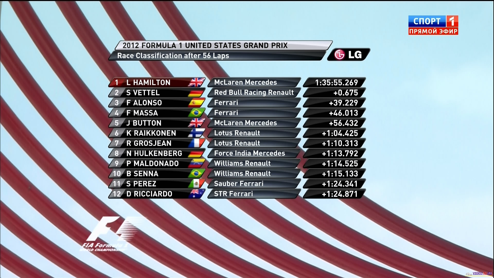 Формула-1 - 2012 - Этап 19 - гран-при США - ГонкаФормула 1 - Гран-при США - ГОНКА - Скачать гонку в обычном разрешении Сезон 2012 года - Этап 19 (Аустин, 17 ноября 2012 года) 2012 FORMULA 1 UNITED STATES GRAND PRIX Round 19 - USA - Austin - Race Гран-при Америки - Гонка - скачать видео гонки Девятнадцатый этап чемпионата мира, гран при США. Последний раз гонки формулы-1 проводились в США в Индианаполисе с 2000 по 2007 гг. Именно на этой трассе и дебютировал Себастьян Феттель, который уже сегодня и именно здесь может стать чемпионом мира. Тогда в 2007 году он принял участие в гонке, заменив Роберта Кубицу на БМВ-Заубер, который попал в страшную аварию гонкой раньше. Тогда он заработал свои первые два очка. Теперь в 2012 году на гран-при США у Феттеля ровно 100-я гонка. Асфальт не имеет никакого держака, как по стеклу, словами Алонсо, плюс холод, плюс жесткий состав шин Пирелли и пилоты еле-еле накатали даже основную траекторию. Вне траектории настолько скользко, что нечетная сторона решетки на старте, наверняка могут провалиться. Посмотреть бесплатно 3 минутный ролик самых интересных моментах в течении гонки гран-при США 2012 сезонаКанал: Россия 2 Продолжительность: 2 часа 28 мин Комментарий: Русский (Алексей Попов, Наталья Фабричнова) Размер файла: 2.5 Gb Формат: AVI Видео: 720x400 (1.80:1), 25 fps, XviD build 50 ~1701 kbps avg Аудио: 48 kHz, MPEG Layer 3, 2 ch, ~128.00 kbps avg ______ ___ __ _ _ Формула-1 2012 гран при США Аустин Гонка скачать видео в обычном SATRip качестве (Без рекламы, одним файлом)(Download gran-prix USA 2012 race ) Вы смотрите Формула-1 - 2012 - Этап 19 - гран-при США - Гонка