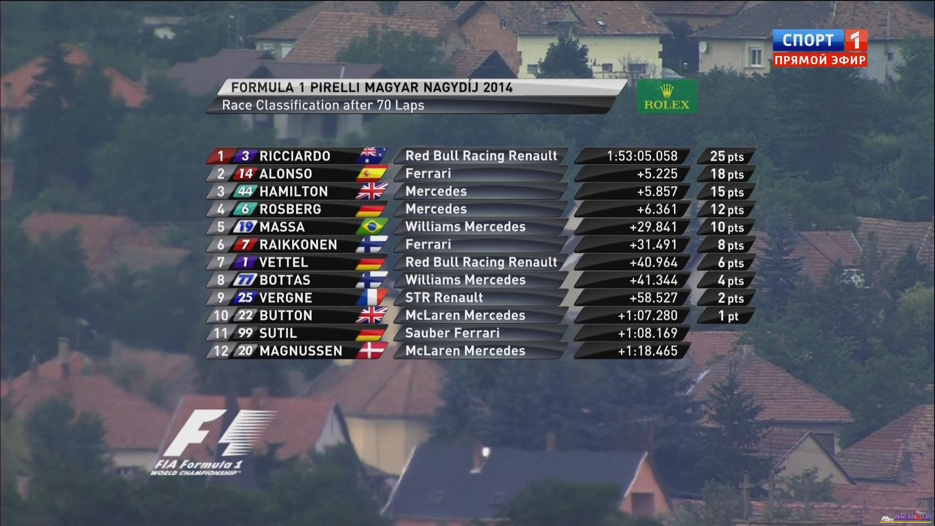 Формула-1 гран-при Венгрии 2014скороФормула-1 - Сезон 2014 - Этап 11 - гран-при Венгрия HUNGARY - Budapest - FORMULA 1 PIRELLI MAGYAR NAGYDÍJ 2014 Трасса немного видоизменилась, это касается первого поворота, который раньше полностью был зеркальной копией 14-го, последнего поворота, который выводит на стартовую прямую. Сама же стартовая прямая была немного удлинена. 29-й гран-при Венгрии. За час до гонки над трассой прошел практически тропический ливень. Два пейс кара, классная борьба в конце гонки Алонсо, который ехал на уже никакой резине не хотел никого пропускать. И нарастающая неприязнь Росберга к Хэмильтону, который отказался подчинится команде из боксов и не пропустил Росберга, который возможно именно по этой причине и не смог войти в тройку лидеров. Дата гонки: 27 июля 2014 г Место проведения: Венгрия, Будапешт. Название трассы: Хунгароринг. Длина круга: 4.381 km Количество кругов: 70 Общая дистанция: 306.630 km Продолжительность видео: 2 часа 44 мин Комментируют гонку: Алексей Попов и Наталья Фабричнова Доступность видео: смотреть в онлайн. Фото с квала: Фото с гонки: Вы смотрите Формула-1 гран-при Венгрии 2014