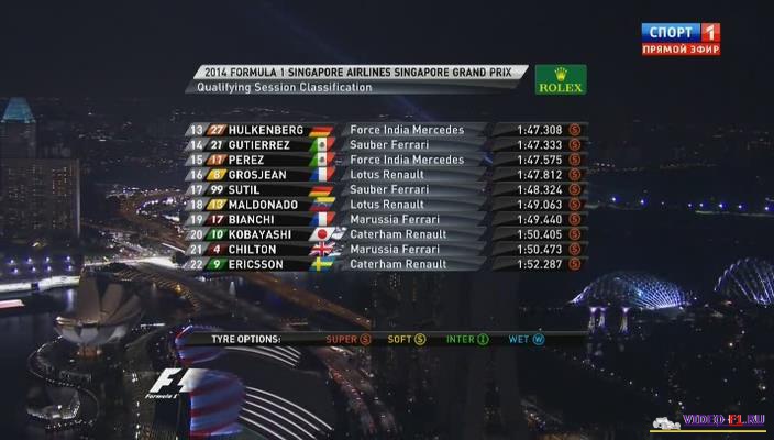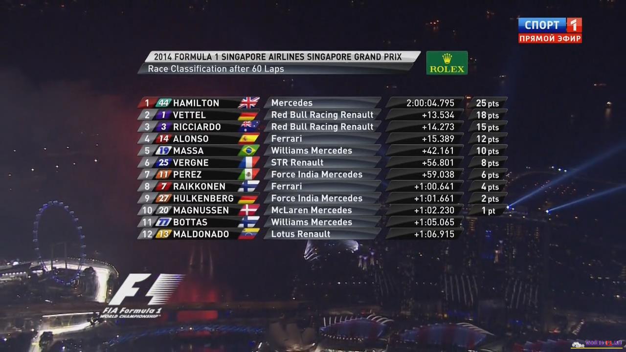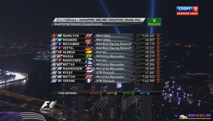 Формула-1 гран-при Сингапур 2014Формула-1 - Сезон 2014 - Этап 14 - гран-при Сингапур Singapore - Marina Bay Street Circuit - 2014 FORMULA 1 SINGAPORE AIRLINES SINGAPORE GRAND PRIX Квалификация в команде Мерседес уже настолько жесткая между соперниками по команде Хэмильтон и Росберг, что когда Росберг проиграл Лэвису пару тысячных, настолько сильна была его эмоция, что по радио он выкрикнул "Damned". 7-й в истории ночное гран-при Сингапура. Дата гонки: 21 сентября 2014 г Место проведения: Сингапур, Марина Бэй. Название трассы: Марина Бэй Уличная страсса. Длина круга: 5.065 km Количество кругов: 61 Общая дистанция: 308.828 km Продолжительность видео: 2 часа 46 мин Комментируют гонку: Алексей Попов и Наталья Фабричнова Фото с гонки: Вы смотрите Формула-1 гран-при Сингапур 2014
