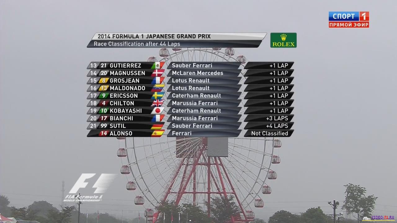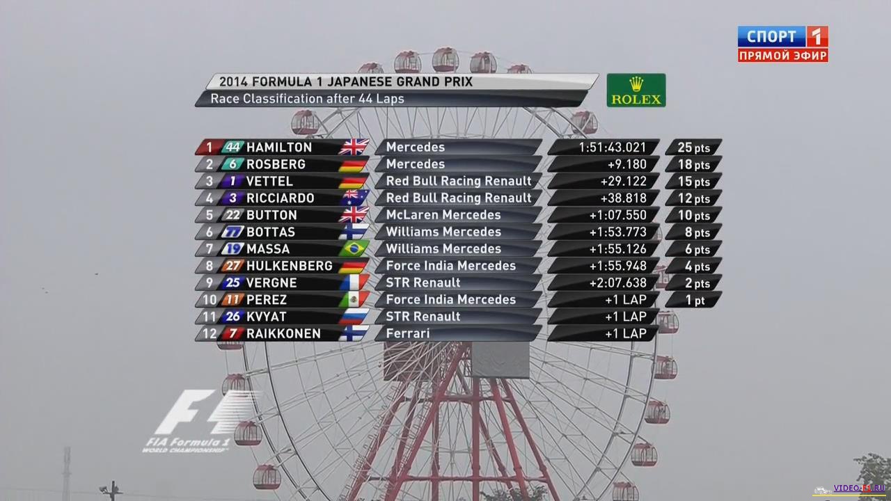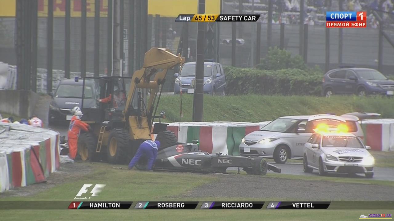 Формула-1 гран-при Япония Сузука 2014Формула-1 - Сезон 2014 - Этап 15 - гран-при Япония Japan - Suzuka - 2014 FORMULA 1 JAPANESE GRAND PRIX В 1962 году голландский архитектор Джон Холицвольд построил эту трассу для Хонды, изначально она даже не должна была быть гоночной, а должна быть тестовая трасса и разные части трассы по замыслам Хонды должны были подвергать нагрузкам разные части автомобиля. Но в итоге гонки начали проводить сначала местные, затем чуть-чуть перестроили трассу и с 1987 года гран при Японии сюда вернулся, потому что в конце 1970х годов дважды проходил на Фудзи. Россиянин Даниил Квят подписал контракт в Ред Булле на следующий год. Префектура Миа между Осакой и Нагоей, где расположена трасса Сузука, которая принимает 30-й гран при Японии и 26-й именно на Сузука, а 4 раза гонки проходили на Фудзи (в 1977-78 и в 2007-08). Гонка в преддверии супер тайфуна Фанфон, который зародился в Тихом океана недалеко от Филиппин. Гонка стартовала под пейс-каром, так как и тайфун и дождь идет очень сильный. С 1 по 10 круг гонщики ехали за пейс каром, так как была плохая видимость из-за мокрой трассы. Джейм Баттон единственный после уход пейс-кара заехал в боксы и поменял дождевую резину на промежуточную и не ошибся, выиграв несколько позиций, когда остальные гонщики только через пару кругов сделали тоже самое. В конце правда Баттон ошибся. Перед красным флагом. Когда вылетел Сутил, трактор начал убирать его машину и в трактор влетел боком французский гонщик Бьянки. Гонку остановили и его госпитализировали с черепно-мозговой травмой в госпиталь. Всю гонку лидировал Нико Росберг, но потом за несколько кругов до остановки гонки, дождь начал усиливаться и его резина перестала держать трассу, Хэмильтон его легко обогнал. Если бы Росберг заехал менять резину в тот момент, и гонка была бы остановлена, то возможно он бы потерял и второе место.. Авария Бьянки К сожалению саму аварию Бьянки как он въехал в трактор не показали в эфире, есть только немного фотографий в интернете. Видео нет. Видео аварии Жуля Бьяинки, трактор подлетел после такого столкновения: Дата гонки: 5 октября 2014 г Место проведения: Япония. Название трассы: Сузука. Длина круга: 5.807 km Количество кругов: 53 (но официально проехали только 44 круга) Общая дистанция: 307.471 km Продолжительность видео: 2 часа 43 мин Комментируют гонку: Алексей Попов и Наталья Фабричнова Фото с гонки: Вы смотрите Формула-1 гран-при Япония Сузука 2014