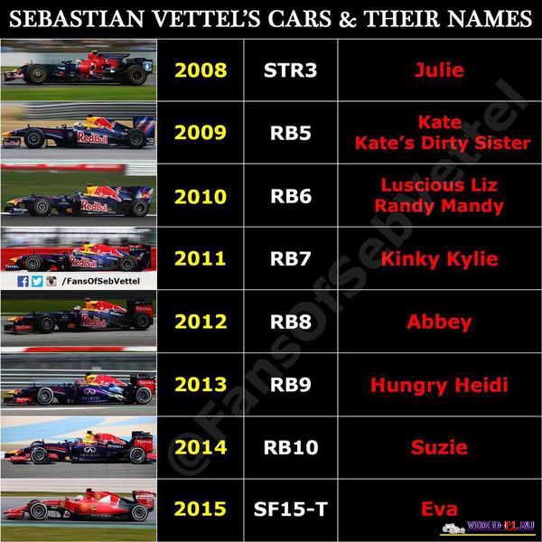 Себастьян ФеттельПолное имя: Себастьян Феттель (Sebastian Vettel) Откуда родом: Германия, г. Хеппенхайм Дата рождения: 3 июля 1987 Гражданство: немецкое Первое участие в гран-при Формулы-1: 2007 г (США, заменил Кубицу) Количество выигранных чемпионатов мира: 4 (2010, 2011, 2012, 2013) Участие в командах: Феррари(2015-2017 гг), Ред Булл (2009-2014 гг), Торо Россо (2007-2008), БМВ (2006-2007). Менеджер пилота: Все имена болидов С.Феттеля: Джули (Julie, 2008 г, STR3), Грязная сестра Кэйт (Kate, 2009 г, RB5), Лиз (Luscious Liz Randy Mandy, 2010 г, RB6), Кинки Кайл (Kinky Kylie, 2011 г, RB7), Эбби (Abbey, 2012 г, RB8), Голодная Хэйди (Hungry Heidi, 2013 г, RB9), Сюзи (Suzie, 2014 г, RB10), Ева (Eva, 2015 г, SF15-T) Семья: девушка Ханна Прайтер, есть дочь Эмили (12.01.2014 г.р.) Последние новости о С.Феттеле и биография из жизни Сэба: 2017 - в паддоке и в команде у Себастьяна Феттеля есть кличка "Синие флаги"; 2017-Июнь-25 на гран при Азербайджана Феттель въезжает в замедлевшего перед пейс-каром Хэмильтона, становится недовольным и делает Хэмильтону брейк-тест и получает 10 секунд стоп энд гоу штраф; - в 2014 году выступая за команду Ред Булл занял лишь 5-е место в чемпионате и решил перейти в команду Феррари; Фото: Категории Гонщики Формулы-1