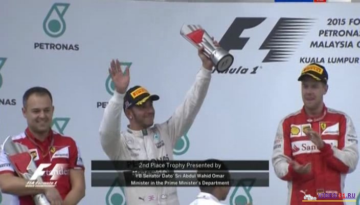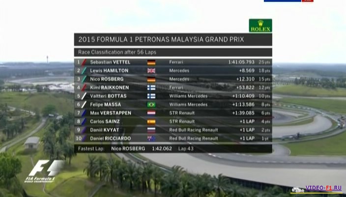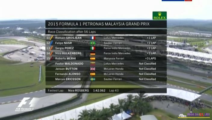 Формула-1 2015 Гран-при Малайзия Сепанг - гонка и квалЭтап 2 - Гран-При МалайзияГород и название трассы: Куала-Лумпур, Сепанг Дата гонки: 29 марта 2015 года Длина круга: 5.543 км Кол-во кругов: 56 Общая дистанция: 310.408 км Гонка:Продолжительность видео: 2:14 ч Комментаторы: Алексей Попов и Наталья Фабричнова. Температура дорожного полотна: 61 С (рекорд) Воздуха - 34С Ветер - 1,5 м/с Влажность - 44% . Сепанг - 17-й раз подряд в истории Малайзии, 2 этап Формулы-1. Идут переговоры чтобы продить гонку на этой трассы на следующий и последующие годы. Трасса примерно в 50 км от столицы и в 15 км от международного аэропорта. Трасса первая из творений Германа Тильке. Одна из самых удачных трасс, здесь есть и медленные повороты и сверхскоростные повороты и две длинные прямые и шпилька между ними. Дождевая квалификация гран при Малайзии:Продолжительность видео: 1:29 ч Комментаторы: Алексей Попов и Наталья Фабричнова. Температура дорожного полотна: Влажность - 2-3 сегмент 100% Дождевая резина. В 17-й раз Малайзия принимает у себя Ф1. Дженсон Баттон сменил мотор на своем болиде. 5 левых и 10 правых поворотов, поэтому на этой трассе больше всего нагрузки испытывает переднее левое колесо. 1 секция была по суху, хотя на планах видны сверкающие молнии. 2 часть квала уже пошел сильный дождь, и почти все гонщики успели проехать быстрый круг на сликах. 3 сегмент начался только после прекращения дождя. Категории Ф1 Сезон 2015 / Гран-При Малайзия