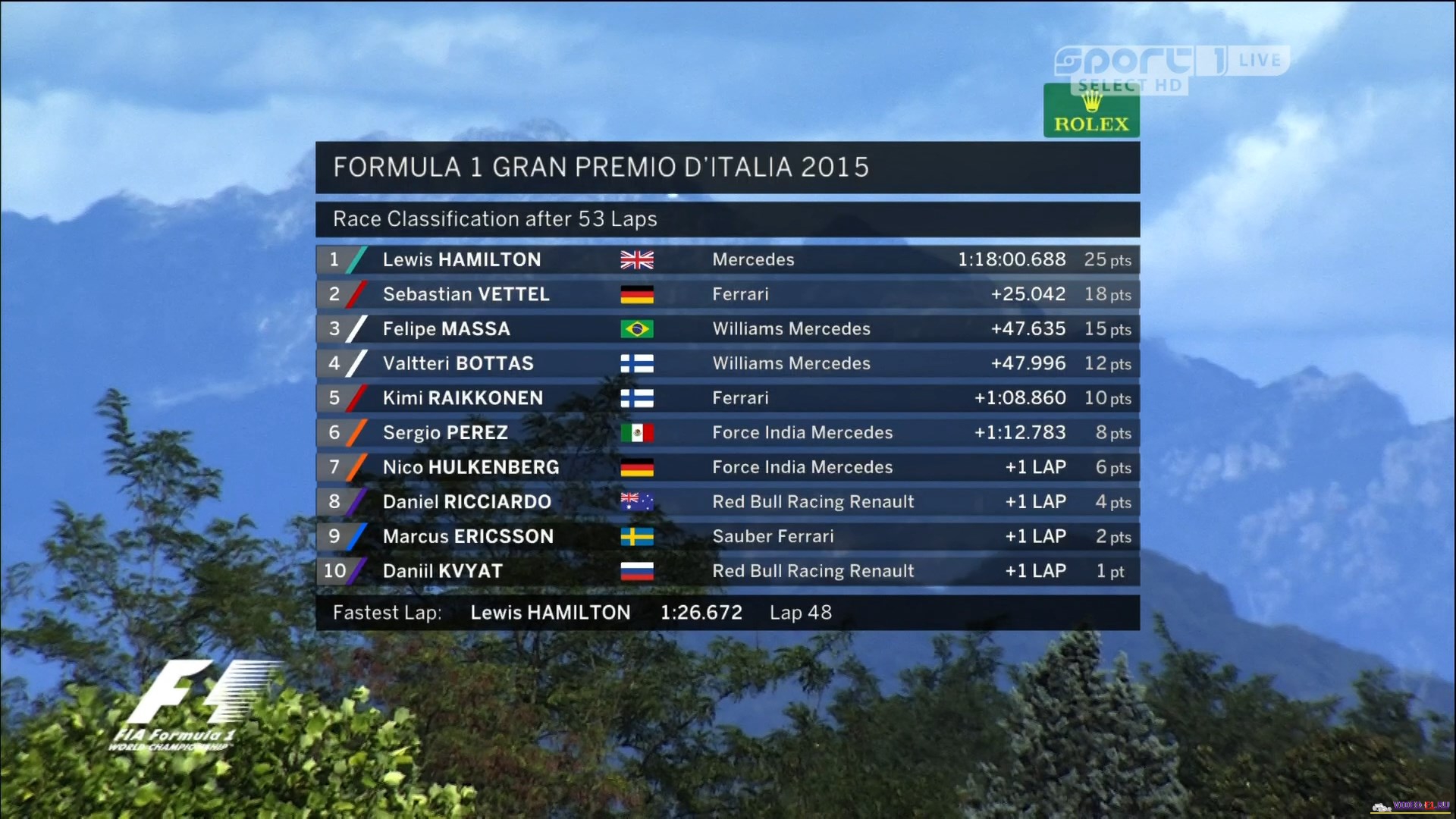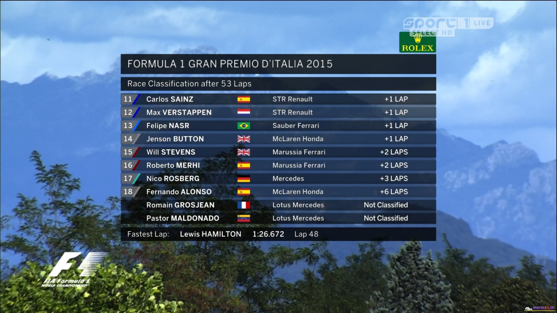 Формула 1 Гран при Италия Монца 2015Лучшие моменты Этап 12 - Гран-При ИталияГород и название трассы: Монца Дата гонки: 6 сентября 2015 года Длина круга: 5.793 км Кол-во кругов: 53 Общая дистанция: 306.72 км Гонка:Продолжительность видео: Комментаторы: Алексей Попов и Наталья Фабричнова. Категории Ф1 Сезон 2015 / Гран-При Италия