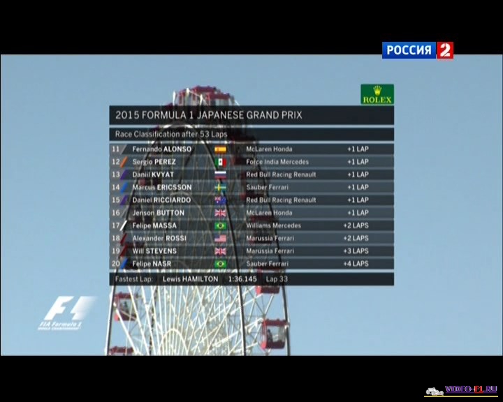 Формула 1 Гран при Япония 2015Лучшие моменты Этап 14 - Гран-При ЯпонияГород и название трассы: Сузука Дата гонки: 27 сентября 2015 года Длина круга: 5.807 км Кол-во кругов: 53 Общая дистанция: 307.471 км На квалификации Даниил Квят не справился с управлением и разбил свой болид, перевернулся на 180 градусов, аж колосе оторвалось. Перед поворотом от задел газон и машина потеряла управление. Пару лет назад такую же ошибку совершил и другой российский пилот Петров. Гонка:Продолжительность видео: 2 ч 1 м Комментаторы: Алексей Попов и Наталья Фабричнова. Категории Ф1 Сезон 2015 / Гран-При Япония