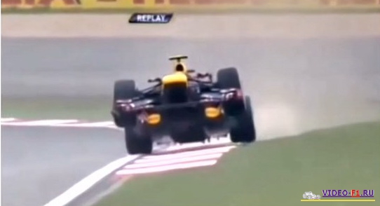 Где и когда болид формулы-1 встал на козла на задние колеса, передние колеса поднялись в воздух?На трассе формулы 1 в Китае в Шанхае, болид Марка Веббера (команда Ред Булл) в 2012 году поднялся передними колесами в воздух и несколько метров ехал только двумя задними колесами. Но потом машина упала на все четыре колеса и продолжила движение по прямой после скоростного 13-го поворота.