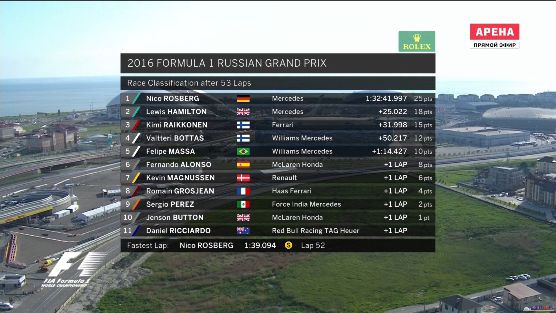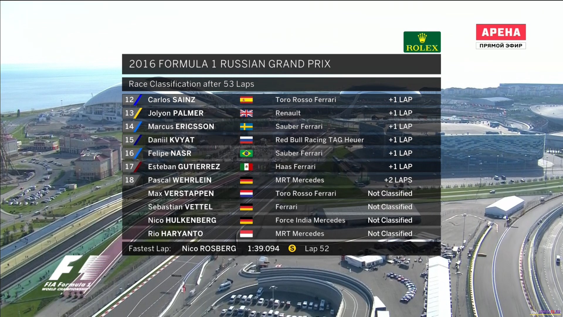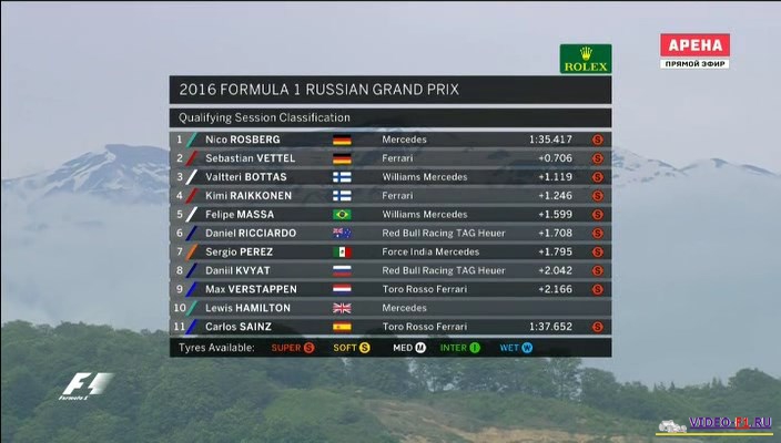 Формула-1 2016 Гран-при Россия Сочи - гонка и квалификацияФормула 1 Этап 4 - Гран-При РоссииГород и название трассы: Россия, Сочи (о трассе) Дата гонки: 1 мая 2016 г Длина круга: 5.848 км Кол-во кругов: 53 Общая дистанция: 309.745 км Что интересного было на гонках Ф1 в России в Сочи Впервые в свободных заездах команда Ред Булл попробовала защитное лобовое стекло на болиде Дэна Рикьярдо. Пока кокпит болида открытый, но в в будущем хотят кокпит болида сделать полностью закрытым. Пока вопрос остается открытым как их правильно очищать. В первой части практики болид Рено тестировал на трассе российский пилот Сергей Сироткин. На квалификации Квят был очень недоволен, что Льюис Хэмильтон не пропустил его на быстром круге. А в квале у Дэна Риккьярдо отломалось боковое зеркало. В третий раз в рамках официального чемпионата мира Ф1, который стартовал в 1950 году и в 5 раз в истории проводится гонка в России. Георгий Суборин и Вилли Шольц на двух машинах Бенц выиграли гран-при России в окрестностях Санкт-Петербурга в 1913 и 1914 годах. Затем получилась гиганская столетняя пауза и в 2014 году здесь на Сочи Автодроме который родился в Олимпийском парке прошел первый в современной истории гран при России. Так как у Льюиса Хэмильтона во время квалификации отказал генератор то он стартует с 10 места. На первом круге после старта Феттель в его жопу врезается опять его друг торпеда Квят, а потом через пару поворотов его Даниил Квят опять подталкивает в задницу и Феттель улетает и врезается с матами в бордюр. Виртуальный пейскар на первом же круге и сразу же выезжает настоящий пейскар, так как много обломков на трассе. На 9 круге Квят получил 10 секундр штрафа Stop$Go за спровоцированное столкновение с немцем Феттелем. 4 подряд в этом сезоне победа Росберга и 7 подряд в карьере, а также "Большой шлем". Формула-1 - Результаты гран-при России: Фотографии с уикенда Сочи в России: Категории Формула 1 Сезон 2016 / Гран-при Россия