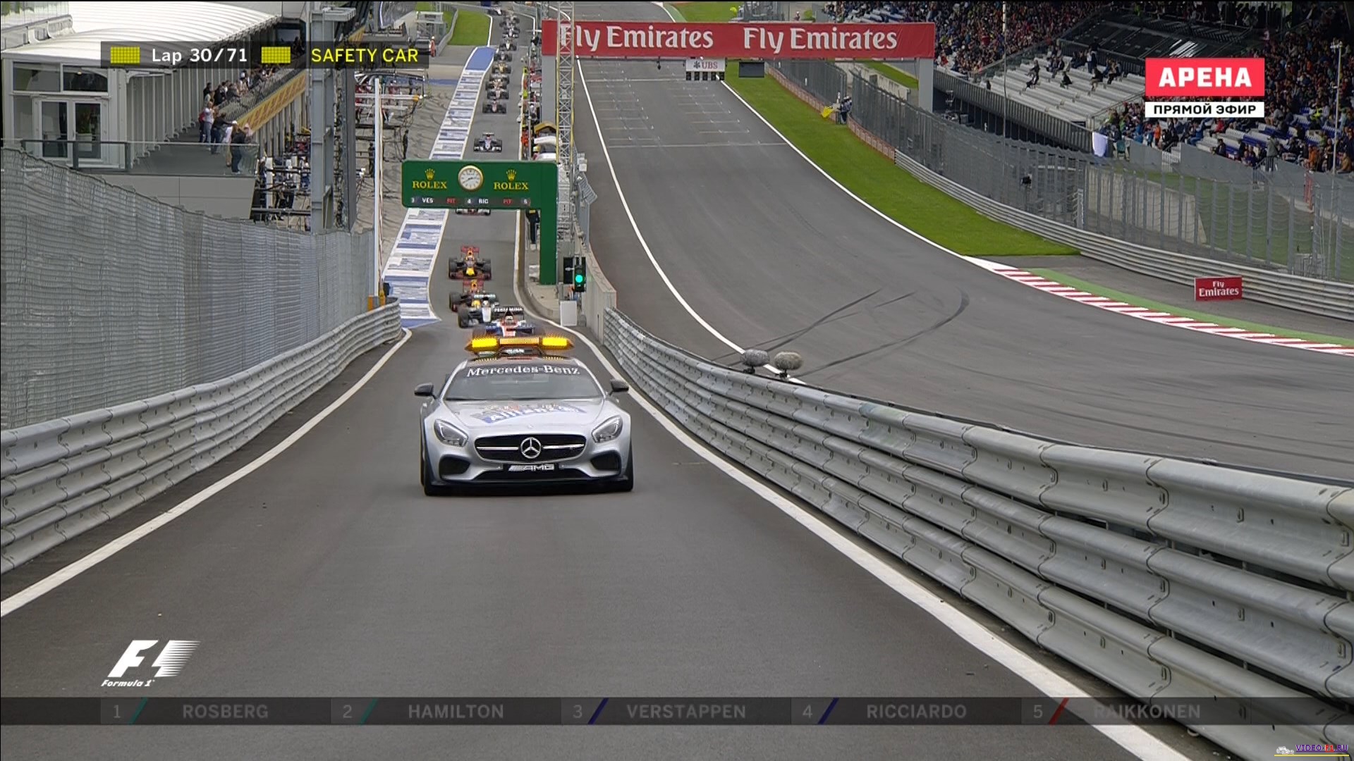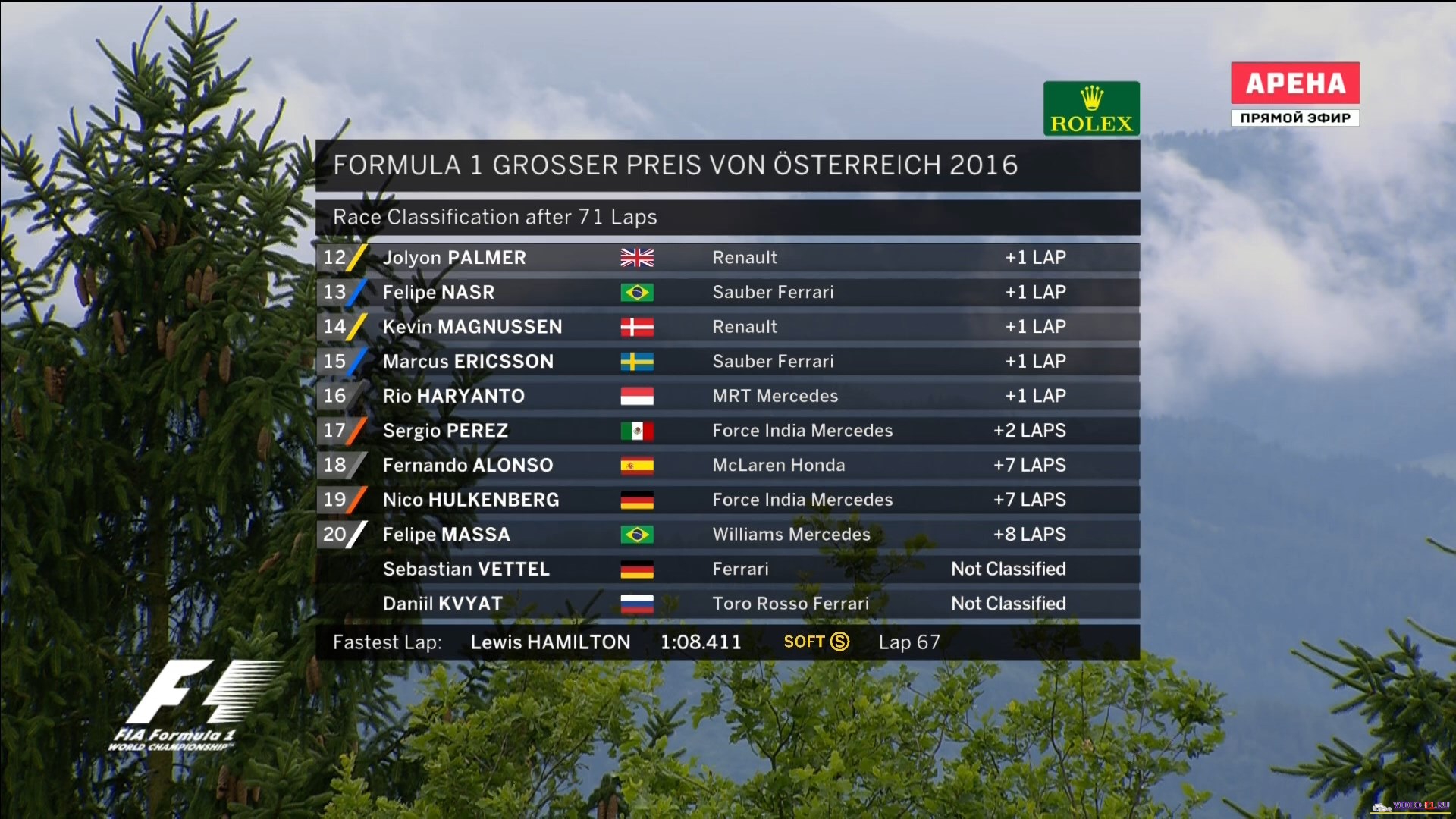 Формула 1 2016 Гран-при АвстрияФормула 1 Этап 9 - Гран-При АвстрияГород и название трассы: Австрия, Шпильберг, рЭД бУЛЛ рИНГ (о трассе) Дата гонки: 3 июля 2016 г Длина круга: 4.326KM Кол-во кругов: 71 Общая дистанция: 307.02 KM Что интересного было на гран-при Формулы 1 в Австрии Возможно последний раз мы видим гонку на трассу этой конфигурации. В следующем году возможна реконструкция некоторых участков. Во второй части тренировки пошел очень сильный дождь. В третьей части свободных заездов Нико Росберг разбивает свой болид, т.к. у него ломается задняя подвеска. На квалификации в бокса Мерседеса находился известный режиссер Джордж Лукас. Российский пилот Даниил Квят на Торро Россо в квале разбивает свой болид, после того как заехал на желтые бордюры у него ломается правая задняя подвеса и сильно разбивается болид. В третьей части квалификации было очень интересно когда на подсыхающей трассе пилоты один за одним улучшали время и до последнего момента был неизвестно кто займет пол позишин. В Гонке была интересная борьба на последнем круге между двумя Мерседесами, Росберг сломал передний спойлер об болид Хэмильтона и упустил победу. На подиуме Хэмильтона очень сильно освистывала публика, и во время интервью девушке он сказал что это не его проблема что люди свистят, а их проблемы. Такого недовольства публики в Австрии на формуле 1 не было с 2002 года. Формула-1 - Результаты гран-при Австрии 2016: Фотографии с уикенда Ф1 в Австрии: Категории Формула 1 Сезон 2016 / Гран-При Австрия