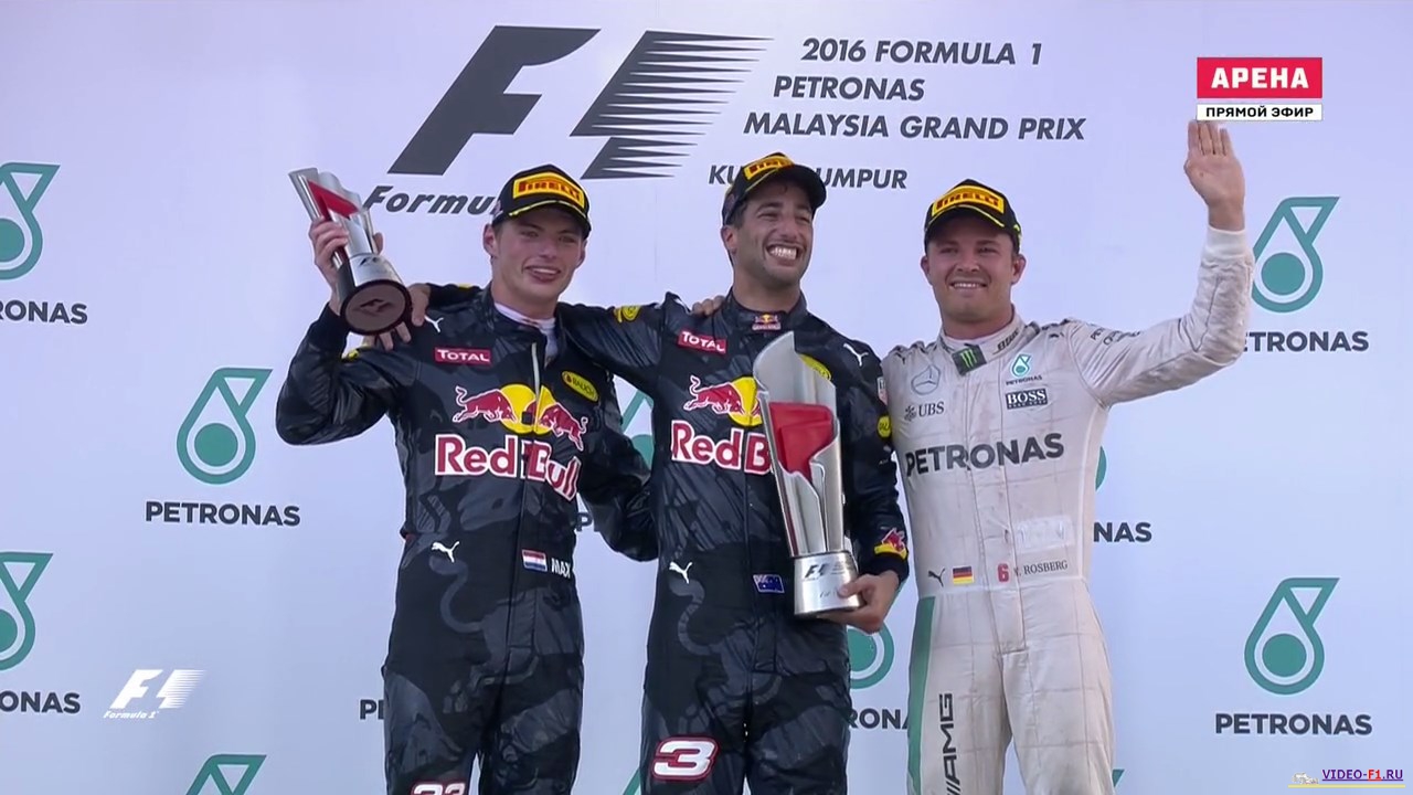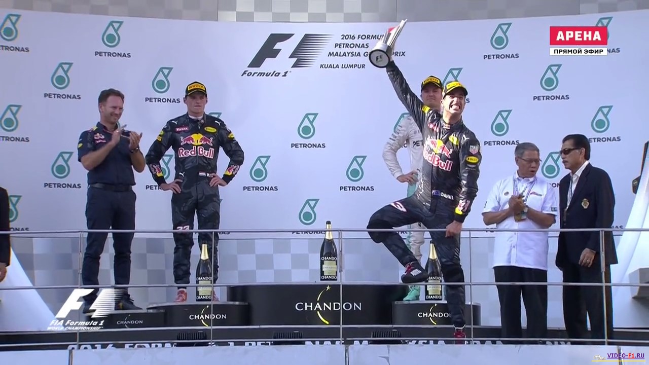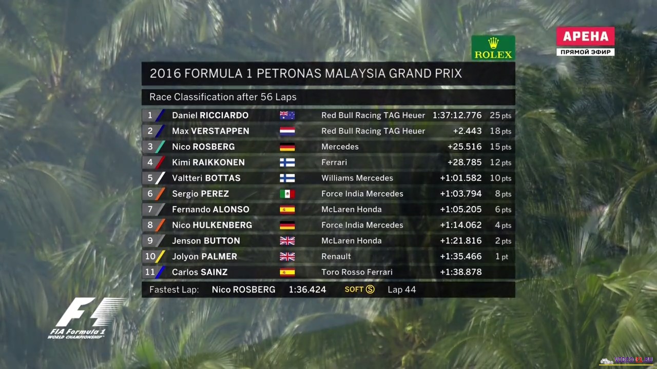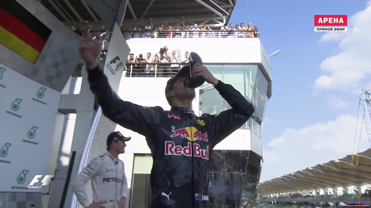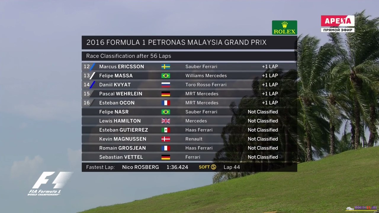 Формула 1 2016 Гран-при МалайзияФормула 1 Этап 16 - Гран-При СингапурГород и название трассы: Малайзия Сепанг (о трассе) Дата ночной гонки: 2 октября 2016 г Длина круга: 5.543 км Кол-во кругов: 56 Общая дистанция 310.408 км Комментатор на матч тв: Алексей Попов (свободные заезды комментирует Владимир Башмаков) Что интересного было на гран-при Формулы 1 на трассе в Сепанг, Обзор гонки В этом году трасса получила новый асфальт, длина круга осталась такой же, но наклон немного изменился, чтобы во время дождя вода быстрее покидала дорожное полотно. На первый свободных заездов загорелась возле боксов желтый болид Рено с Кевином Магнуссеном, который очень быстро успел выпрыгнуть из болида. Машину очень долго тушили, топливо все время вытекало через маленькое отверстие сверху. В квалификации у Романа Грожана оторвалось зеркало бокового вида, болталось, оторвалось и чуть не попало ему в лицо в шлем. В начале гонке на первом повороте Феттель врезался в Росберг и сломал рычаги переднего колеса, Росберга развернуло и ему пришлось прорываться всю гонку через весь пелетон. У Хэмильтона за несколько кругов до финиша загорелся мотор. Росбергу добавили штраф 10 секунд ко времени гонки но он сумел оторваться от Райкконена и сохранить третье место. Даниил Квят второй раз совершает ошибку в сезоне и врезается впереди идущую машину. Макс Ферстаппен обогнал Кими Райкконена во время виртуального сэйф кара, но ему никакого наказания не последовало. В болиде Хаас у Эстебана Гутиераза отлетело колесо во время движения, механики забыли его прикрутить во время пит-стопа. На подиуме австралиец Дэн Риккьярдо по традиции выпил шампанского из своего боевого ботинка, а также заставил выпить из своей же обуви напарника Ферстаппена и Нико Росберга. Интервью брал Марк Веббер который выбросил этот ботинок в толпу, чтобы опять из него не пить. Формула-1 - Результаты гран-при Малайзии 2016 Фото с уикенда Ф1 в Малайзии Категории Формула 1 Сезон 2016 / Гран-При Малайзия