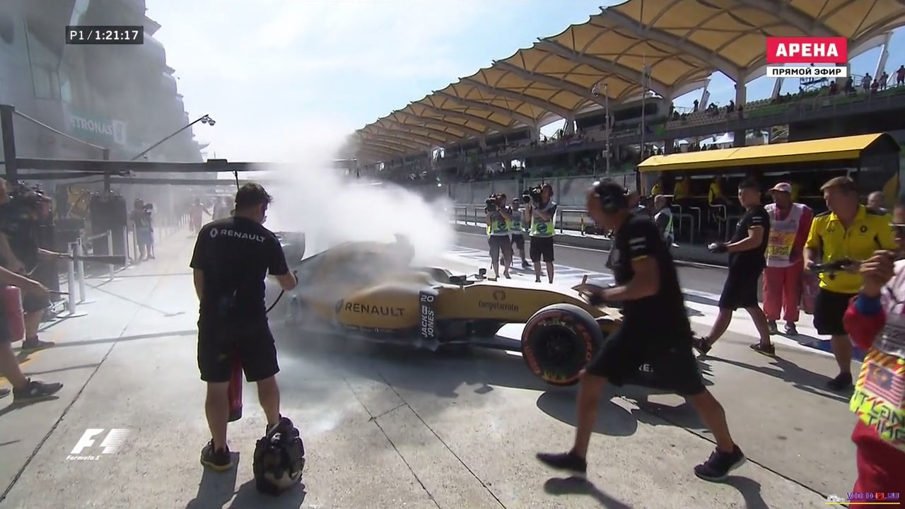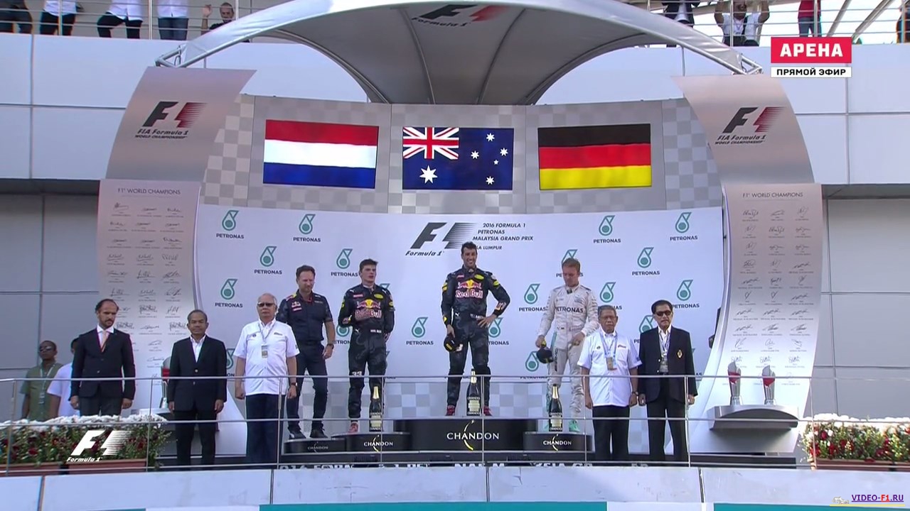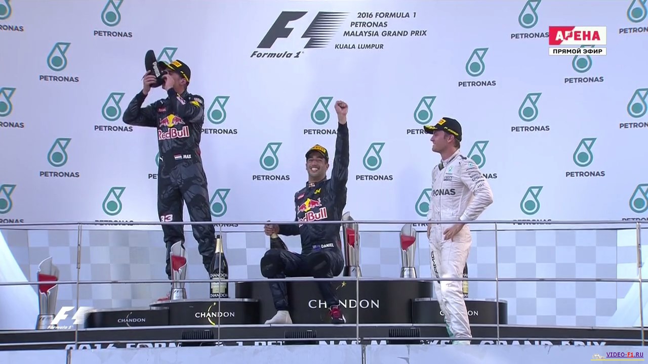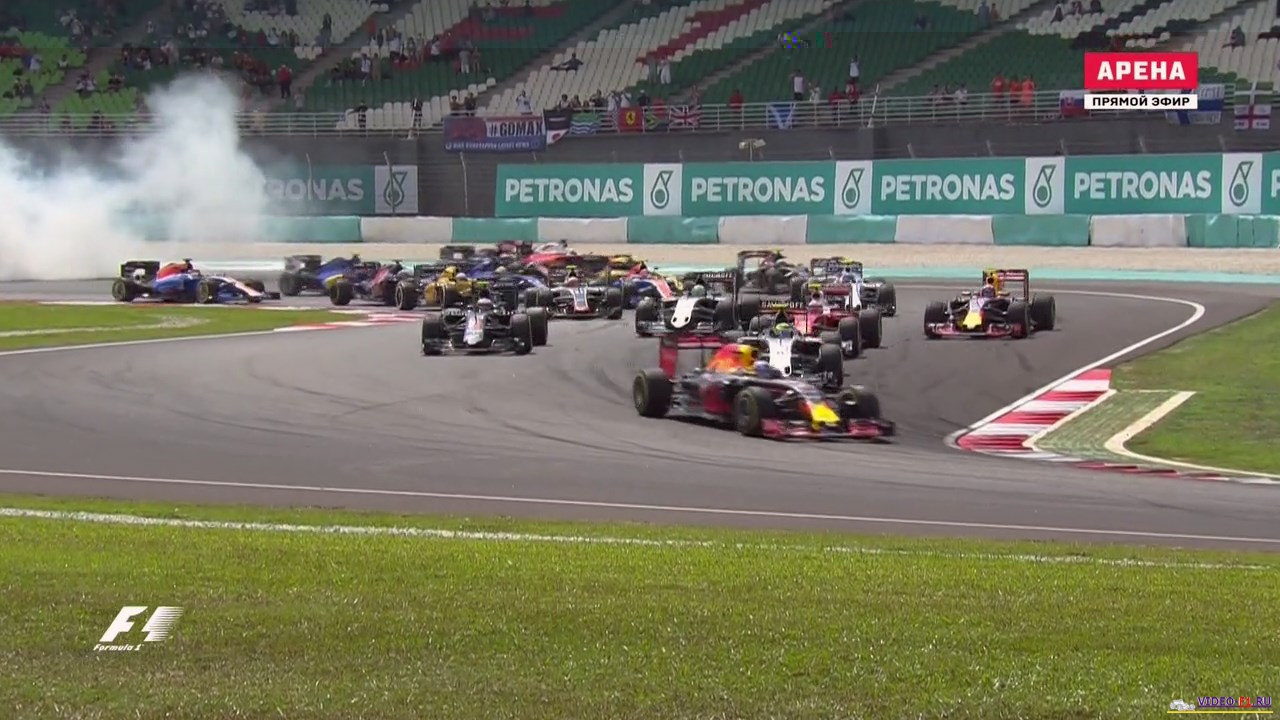 Формула 1 2016 Гран-при МалайзияФормула 1 Этап 16 - Гран-При СингапурГород и название трассы: Малайзия Сепанг (о трассе) Дата ночной гонки: 2 октября 2016 г Длина круга: 5.543 км Кол-во кругов: 56 Общая дистанция 310.408 км Комментатор на матч тв: Алексей Попов (свободные заезды комментирует Владимир Башмаков) Что интересного было на гран-при Формулы 1 на трассе в Сепанг, Обзор гонки В этом году трасса получила новый асфальт, длина круга осталась такой же, но наклон немного изменился, чтобы во время дождя вода быстрее покидала дорожное полотно. На первый свободных заездов загорелась возле боксов желтый болид Рено с Кевином Магнуссеном, который очень быстро успел выпрыгнуть из болида. Машину очень долго тушили, топливо все время вытекало через маленькое отверстие сверху. В квалификации у Романа Грожана оторвалось зеркало бокового вида, болталось, оторвалось и чуть не попало ему в лицо в шлем. В начале гонке на первом повороте Феттель врезался в Росберг и сломал рычаги переднего колеса, Росберга развернуло и ему пришлось прорываться всю гонку через весь пелетон. У Хэмильтона за несколько кругов до финиша загорелся мотор. Росбергу добавили штраф 10 секунд ко времени гонки но он сумел оторваться от Райкконена и сохранить третье место. Даниил Квят второй раз совершает ошибку в сезоне и врезается впереди идущую машину. Макс Ферстаппен обогнал Кими Райкконена во время виртуального сэйф кара, но ему никакого наказания не последовало. В болиде Хаас у Эстебана Гутиераза отлетело колесо во время движения, механики забыли его прикрутить во время пит-стопа. На подиуме австралиец Дэн Риккьярдо по традиции выпил шампанского из своего боевого ботинка, а также заставил выпить из своей же обуви напарника Ферстаппена и Нико Росберга. Интервью брал Марк Веббер который выбросил этот ботинок в толпу, чтобы опять из него не пить. Формула-1 - Результаты гран-при Малайзии 2016 Фото с уикенда Ф1 в Малайзии Категории Формула 1 Сезон 2016 / Гран-При Малайзия