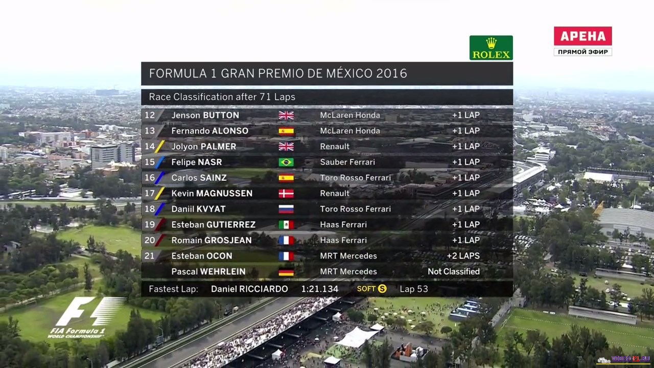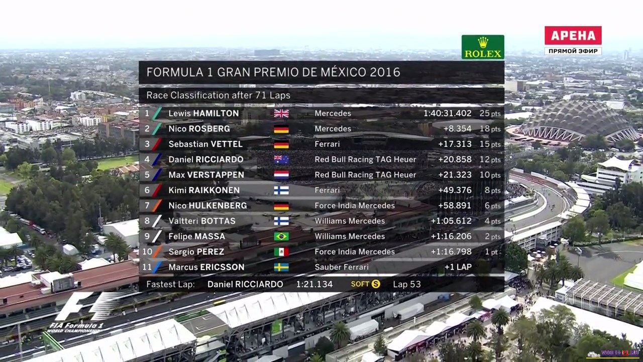 Формула 1 2016 Гран-при МексикиФормула 1 Этап 19 - Гран-При МексикаГород и название трассы: Мексика, Мехико (о трассе) Дата гонки: 30 октября 2016 г Длина круга: 4.304 км Кол-во кругов: 71 Общая дистанция 305.354 км Комментатор на матч тв: Алексей Попов (свободные заезды комментирует Владимир Башмаков) Что интересного было на гран-при Формулы 1 на трассе братьев Родригез, краткий обзор гонки 29 октября 2016 года у босса формулы-1 Берни Эклстоуна было день рождение. В конце гонки Макс Ферстаппен срезал круг и не пропустил Феттеля, не отдал ему позицию. Уже когда перед выходом на подиум Макс увидел что ему добавили 5 секунд и пришлось уступить его третье место Феттелю и пропустить его на подиум. Формула-1 - Результаты гран-при Мексики 2016 Фото с уикенда Ф1 на гран при Мексика Категории Формула 1 Сезон 2016 / Гран-При Мексика