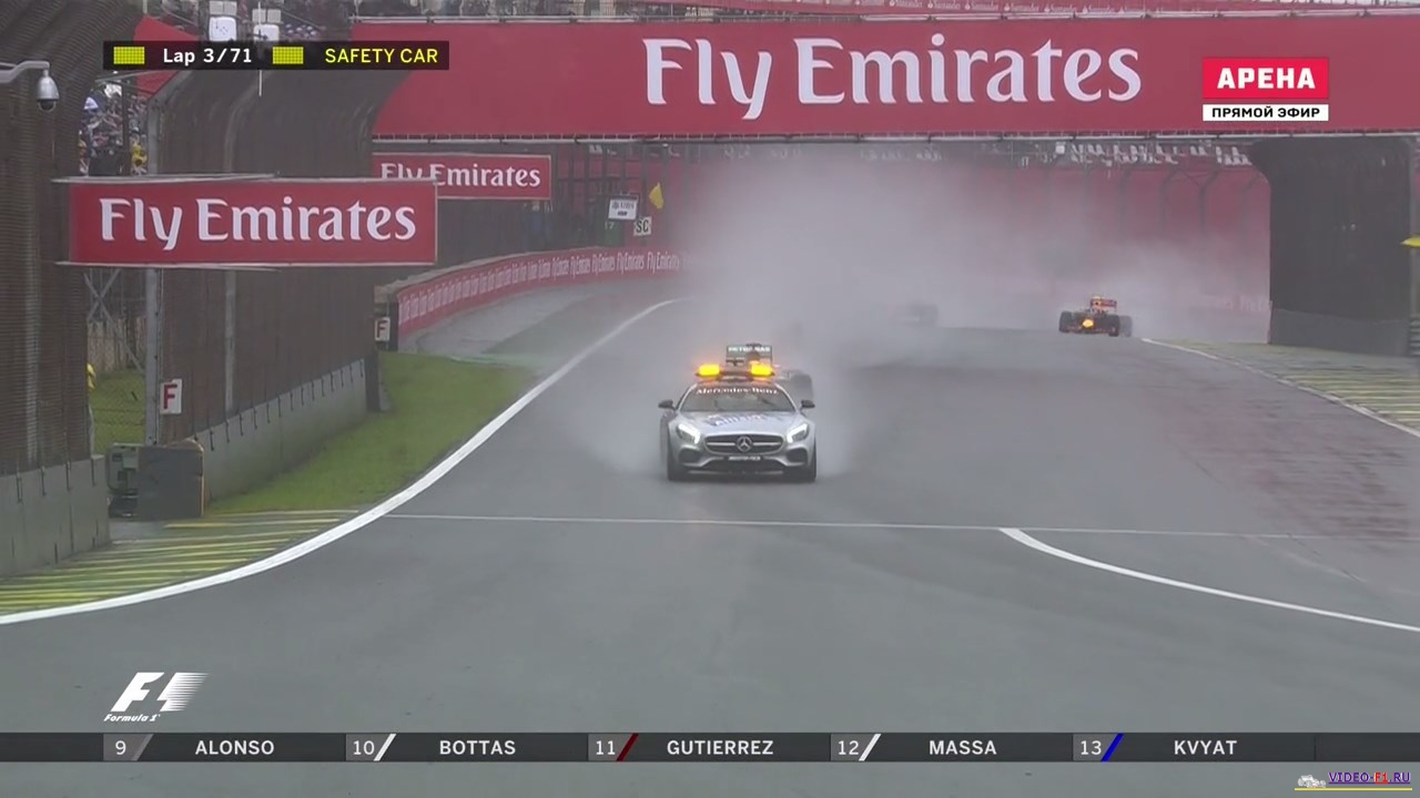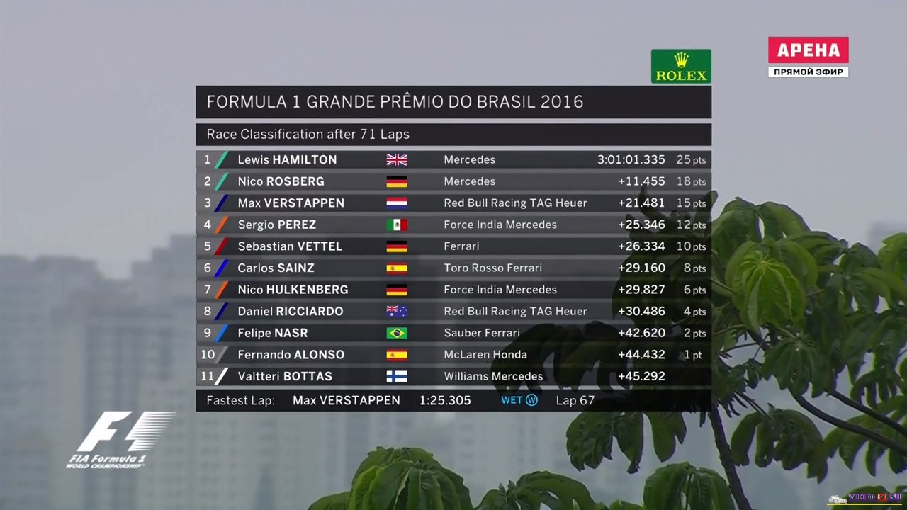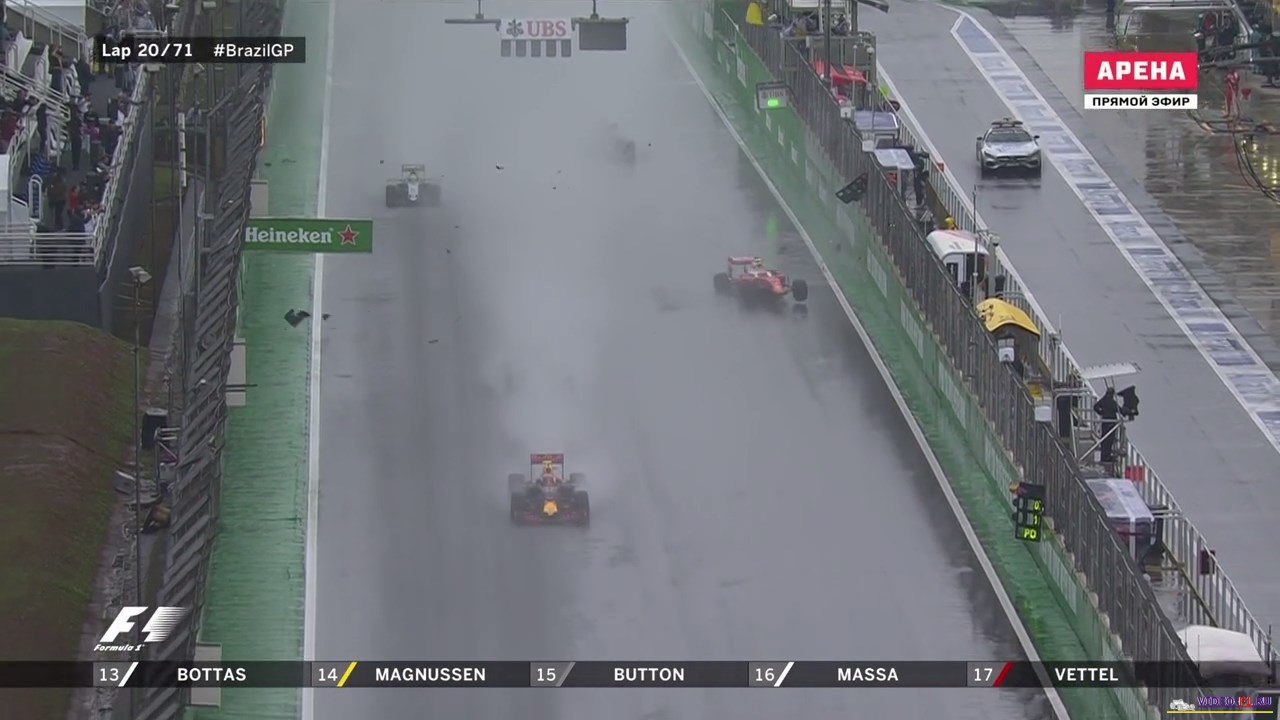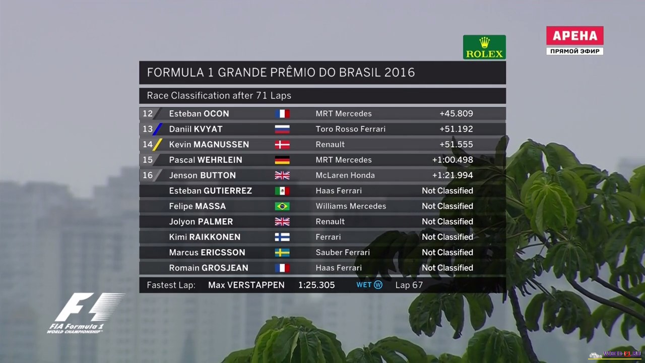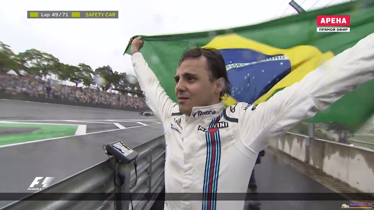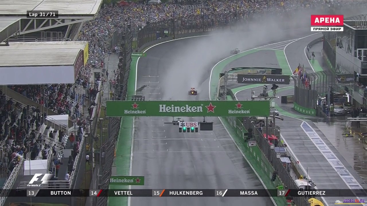 Формула 1 2016 Гран-при БразилииФормула 1 Этап 20 - Гран-При БразилииГород и название трассы: Сан-Пауло, Интерлагос (о трассе) Дата гонки: 13 ноября 2016 г Длина круга: 4.309 км Кол-во кругов: 71 Общая дистанция 305.909 км Комментатор на матч тв: Алексей Попов (свободные заезды комментирует Владимир Башмаков) Краткий обзор гонки, что интересного было на гран при в Бразилии В 1-х свободных заездах в болиде команды Рено сидел российский гонщик Сергей Сироткин, у после первой попытки сломалась машина. ДОЖДЕВАЯ ГОНКА длившаяся 2 часа и 2 часа ждали под красными флагами. МНого аварий и сходов. Супер прорыв Макса Ферстапена по мокрой трассе на пути к подиуму. Формула-1 - Результаты гран-при Бразилии 2016 Фото с уикенда Ф1 на гран при Бразилии Категории Формула 1 Сезон 2016 / Гран-При Бразилия