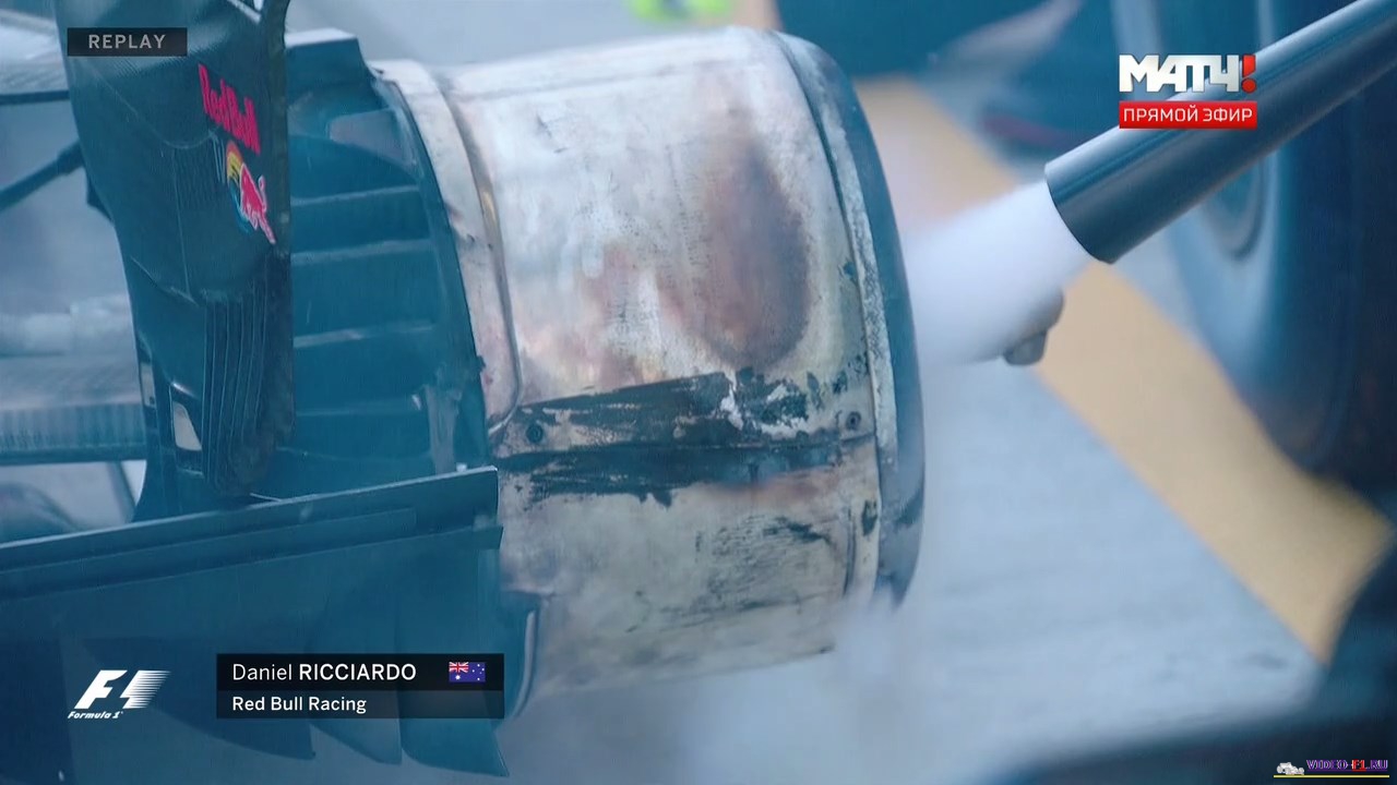 Риккардо сошел из-за проблем с задними тормозами, они начали дымиться.