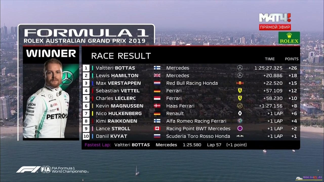 Note - Bottas scored an additional point for setting the fastest lap of the race. Быстрый круг - 77 Bottas 57 17:37:32 1:25.580 223.075 (получает первое +1 очко)