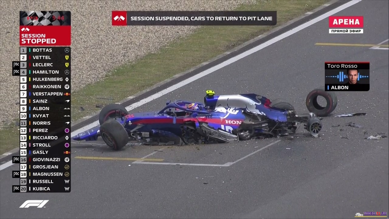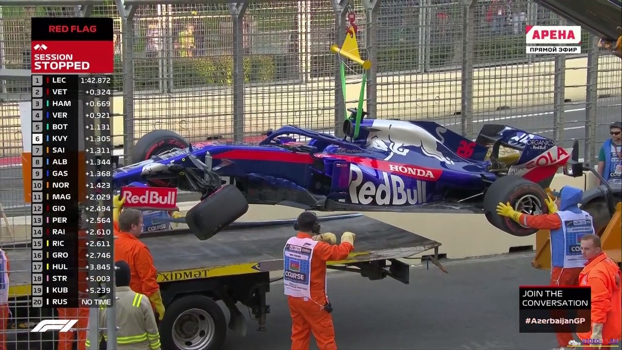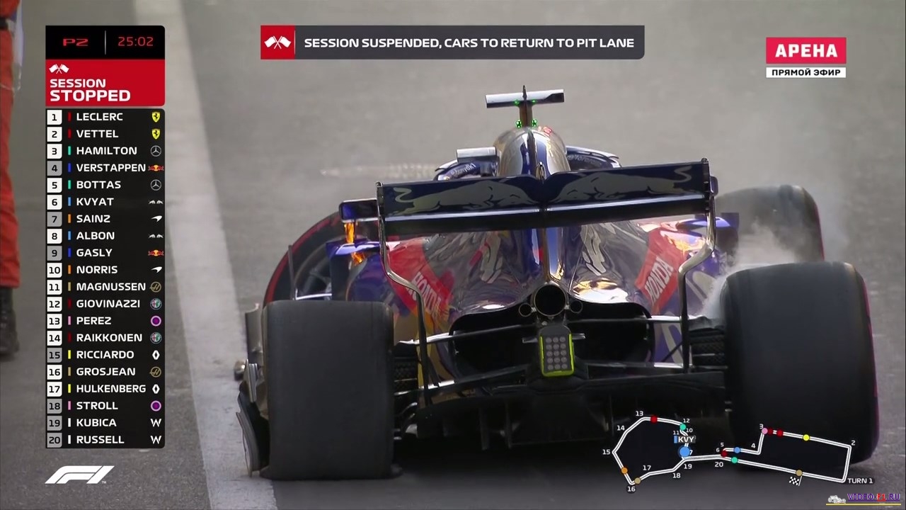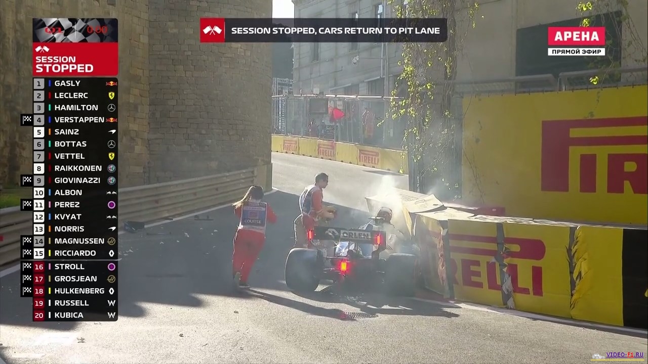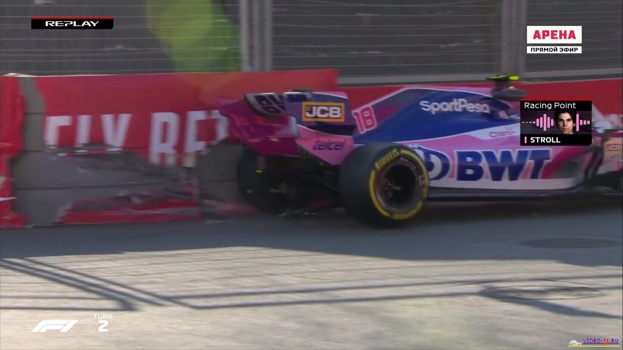 2 практрика Стролл в команде Рэйсинг Поинт не вписался в поворот и разбил свой болид вызвав красный флаг. Интервью с Даниил Квятом у которого 26 числа день рождение, ему 25 лет. К концу практики он разбил свой болид на повороте. У него загорелось переднее сломанное колесо.