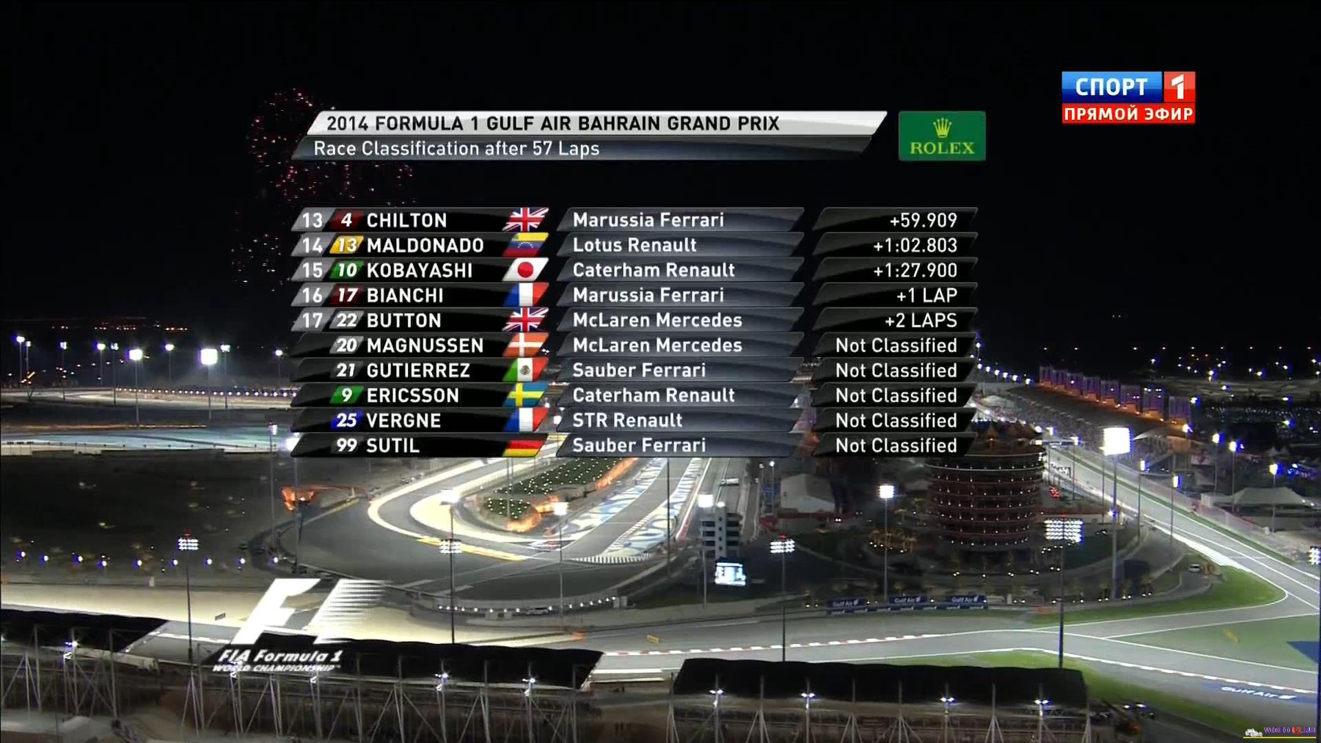 Формула 1 2014 гран-при Бахрейн - ГонкаФормула-1 - Сезон 2014 - Этап 3 - гран-при Бахрейн САХИР - ГОНКА BAHRAIN, Sakhir, Bahrain International Circuit - 2014 FORMULA 1 GULF AIR BAHRAIN GRAND PRIX Автодром Сахир в королевстве Бахрейн, который в 10 раз в истории принимает у себя гран-при Формулы-1. 3 этап чемпионата мира 2014 года. 900-я гонка Формулы-1, если считать 11 500-миль Индианаполиса, которые в 50-е по 60-е годы входили в зачет чемпионата. По другой версии через 11 гран-при будет 900 чистых гонок Ф1. 150-я гонка у обладателя Поул-позишина Нико Росберга. 250-я гонка у Дженсона Баттона. 150-я гонка у команды Торо Россо. Дата гонки: 6 апреля 2014 г Место проведения: Бахрейн, Сахир. Название трассы: Бахир интернешенел круг. Длина круга: 5.412 км Общая дистанция: 308.238 км Продолжительность онлайн видео: 2 часа 17 мин Комментирует гонку: Алексей Попов и Наталья Фабричнова Доступность видеопотока: смотреть в онлайн. Фото с гонки: Вы смотрите Формула 1 2014 гран-при Бахрейн - Гонка