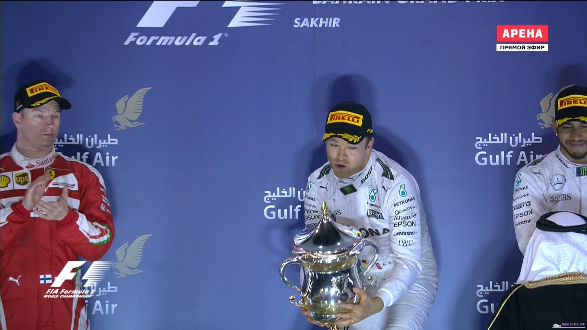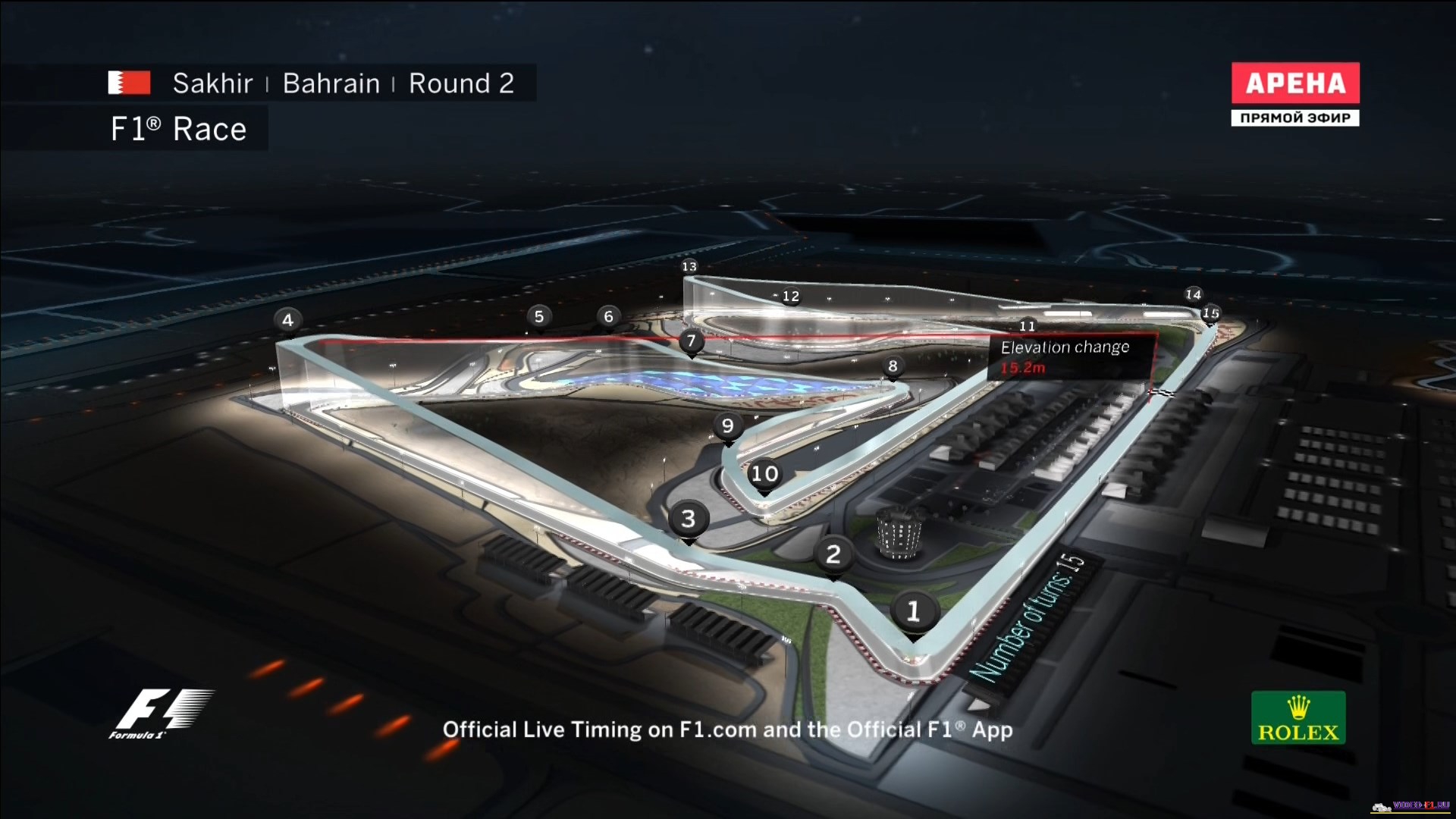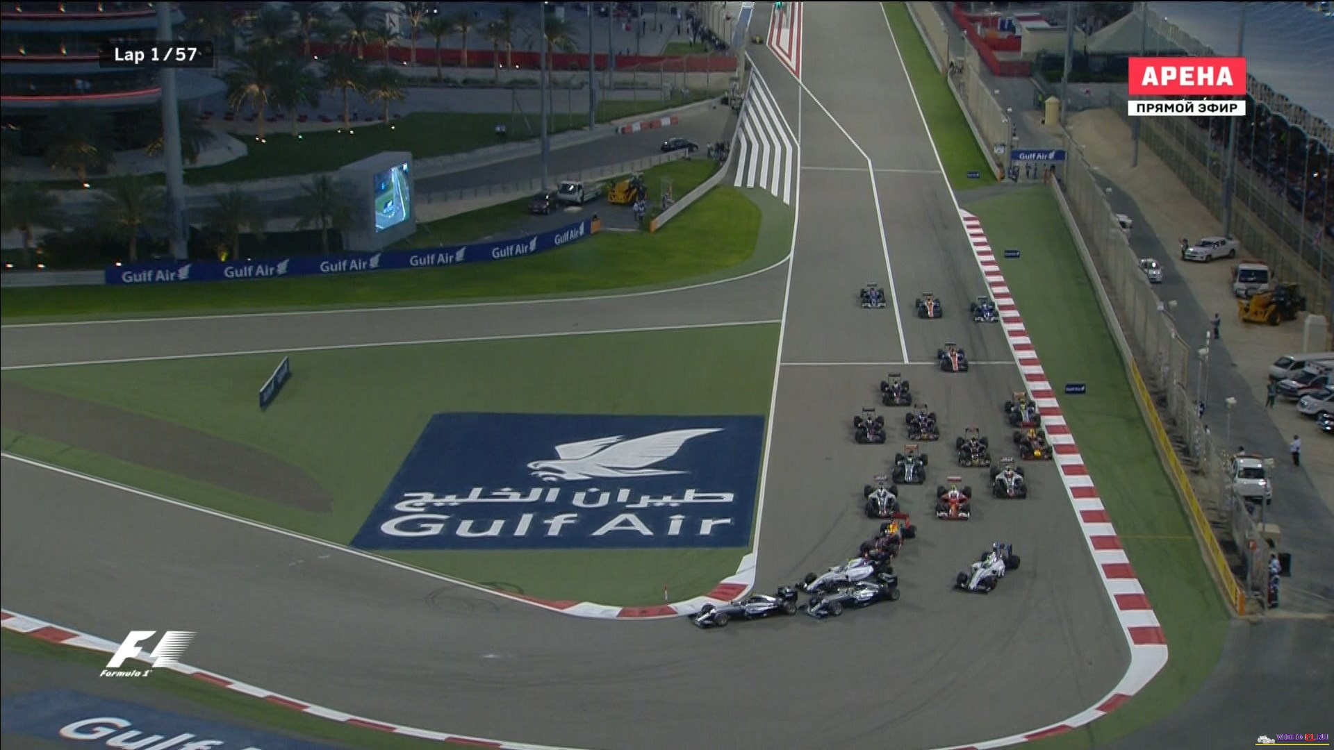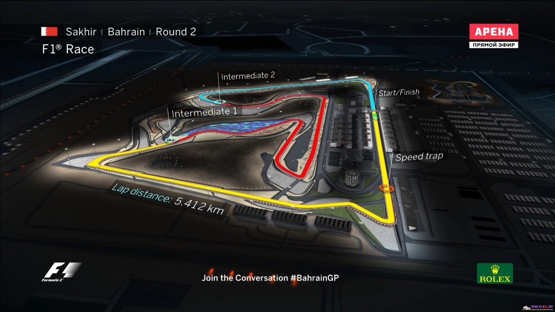 Описание 12-й в истории гран-при в маленьком государстве Бахрейна находящимся в Персидском заливе. Гонки проводятся с 2004 года (в 2006 и 2010 годах здесь даже начинался сезон). Гонка начинается на закате и плавно переходит в ночную. В 5 км от трассы находится музей нефти и первая скважина на территории Бахрейна, где в 1932 году впервые на Ближнем Востоке была обнаружена нефть. На прогревочном круге у Феттеля задымился мотор Феррари и он выбывает из гонки даже не стартовав. У Сайнза на втором круге разбортовывается колесо и резина совершает долгий проезд по трассе. На последнем круге была интересная борьба между Квятом и Массой за 7 место, в то время когда их на круг обходил лидер гонки Росберг и в своей борьбе они его чуть снова не обогнали.