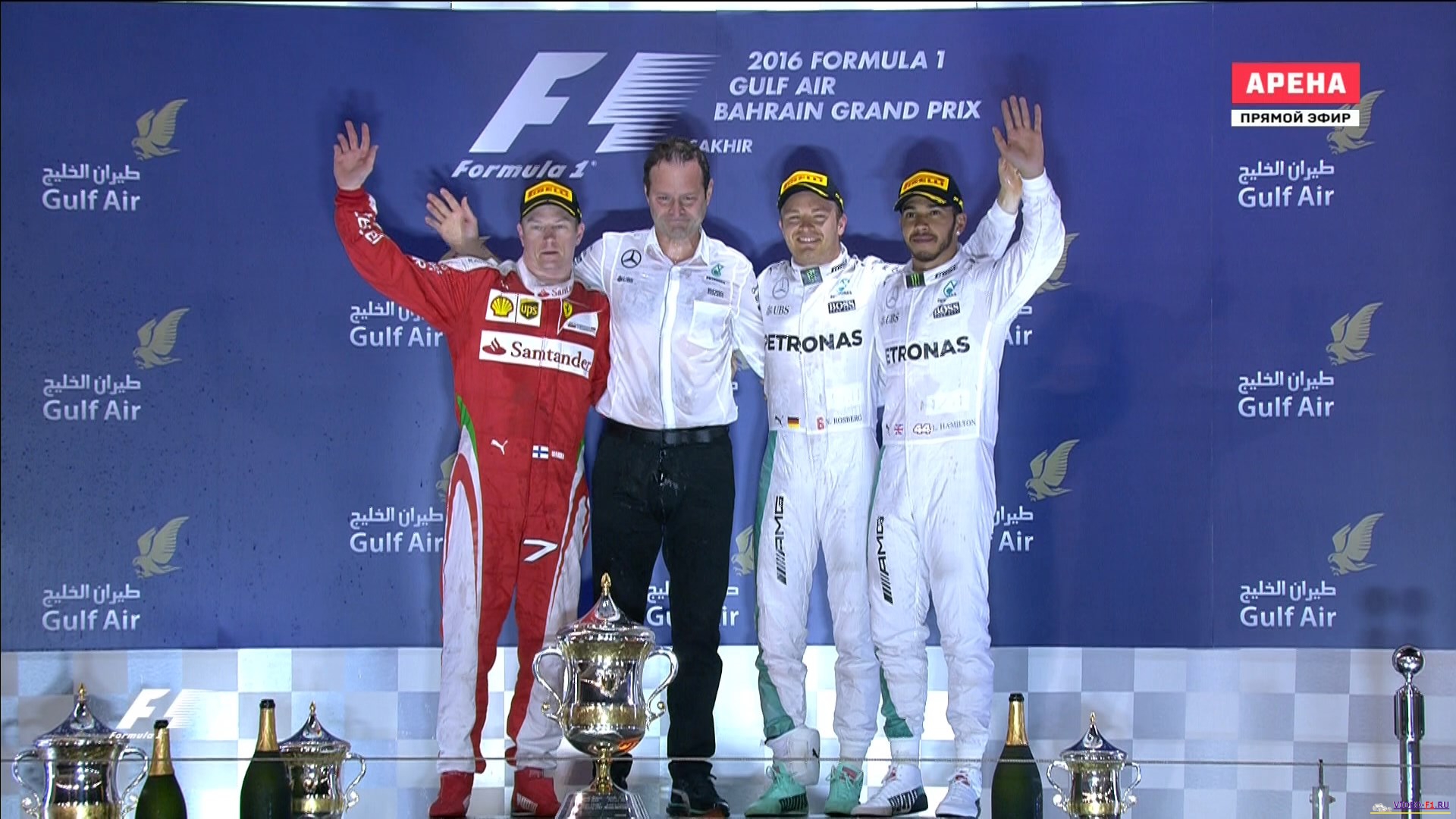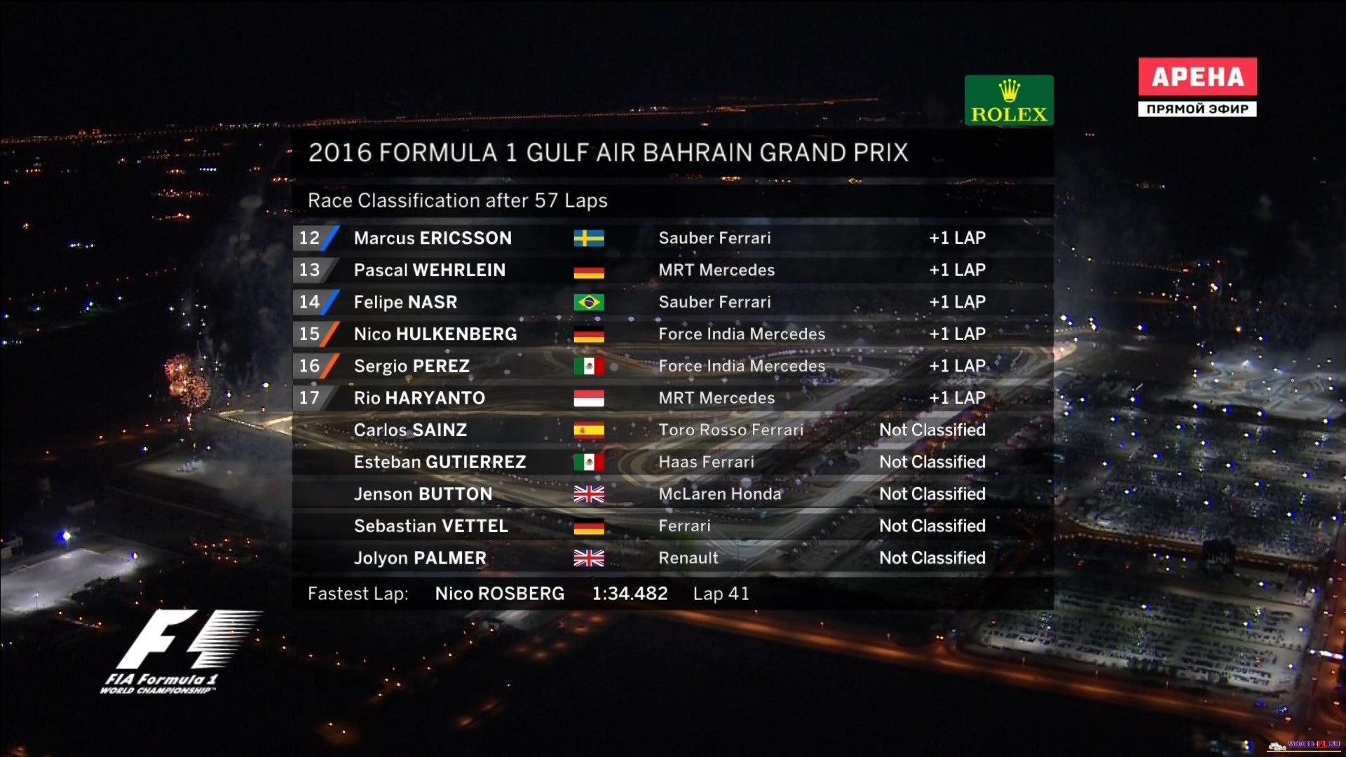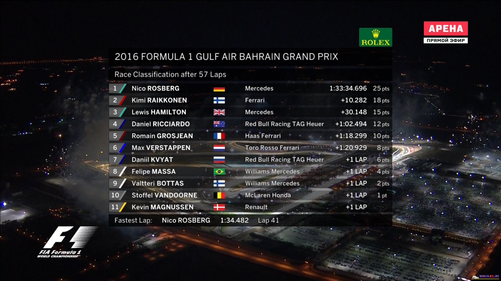 1 Nico Rosberg GER Mercedes 1:33:34.696 25 2 Kimi Räikkönen FIN Ferrari +10.282s 18 3 Lewis Hamilton GBR Mercedes +30.148s 15 4 Daniel Ricciardo AUS Red Bull Racing +62.494s 12 5 Romain Grosjean FRA Haas +78.299s 10 6 Max Verstappen NED Toro Rosso +80.929s 8 7 Daniil Kvyat RUS Red Bull Racing +1 lap 6 8 Felipe Massa BRA Williams +1 lap 4 9 Valtteri Bottas FIN Williams +1 lap 2 10 Stoffel Vandoorne BEL McLaren +1 lap 1 11 Kevin Magnussen DEN Renault +1 lap 0 12 Marcus Ericsson SWE Sauber +1 lap 0 13 Pascal Wehrlein GER Manor +1 lap 0 14 Felipe Nasr BRA Sauber +1 lap 0 15 Nico Hulkenberg GER Force India +1 lap 0 16 Sergio Perez MEX Force India +1 lap 0 17 Rio Haryanto INA Manor +1 lap 0 NC Carlos Sainz ESP Toro Rosso DNF 0 NC Esteban Gutierrez MEX Haas DNF 0 NC Jenson Button GBR McLaren DNF 0 NC Sebastian Vettel GER Ferrari DNS 0 NC Jolyon Palmer GBR Renault DNS 0